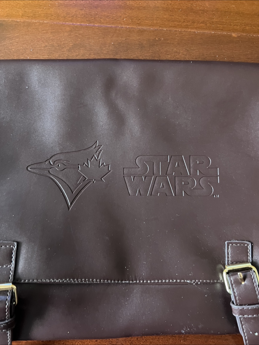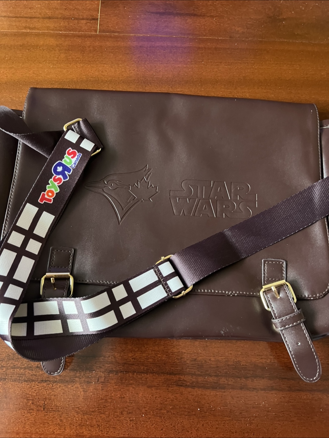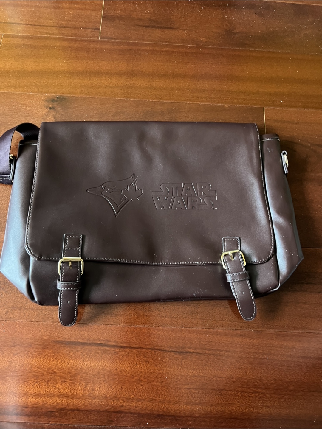Here's a cool collaboration item: a Star Wars messenger bag featuring the Toronto Blue Jays/ Stars Wars logo! It's a dark brown colour and in unused new condition. Perfect for any Star Wars or Blue Jays fan!