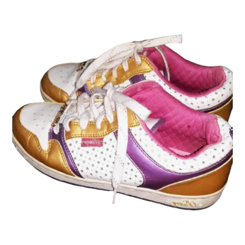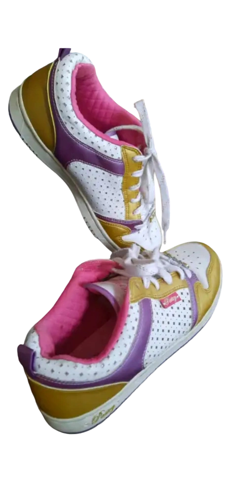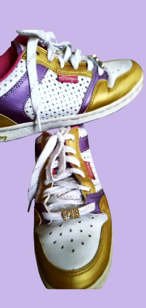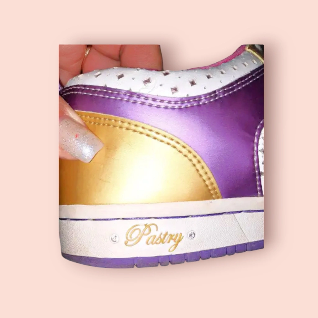 These are a pair of Pastry athletic shoes. They feature a white base with gold and purple accents, and a pink interior. They're in good condition and ready for a new home!