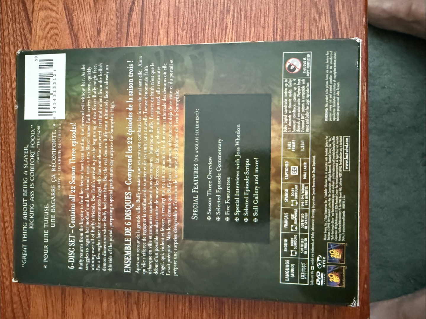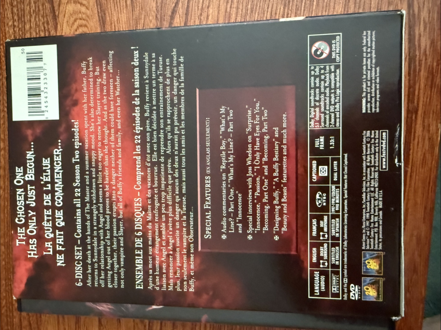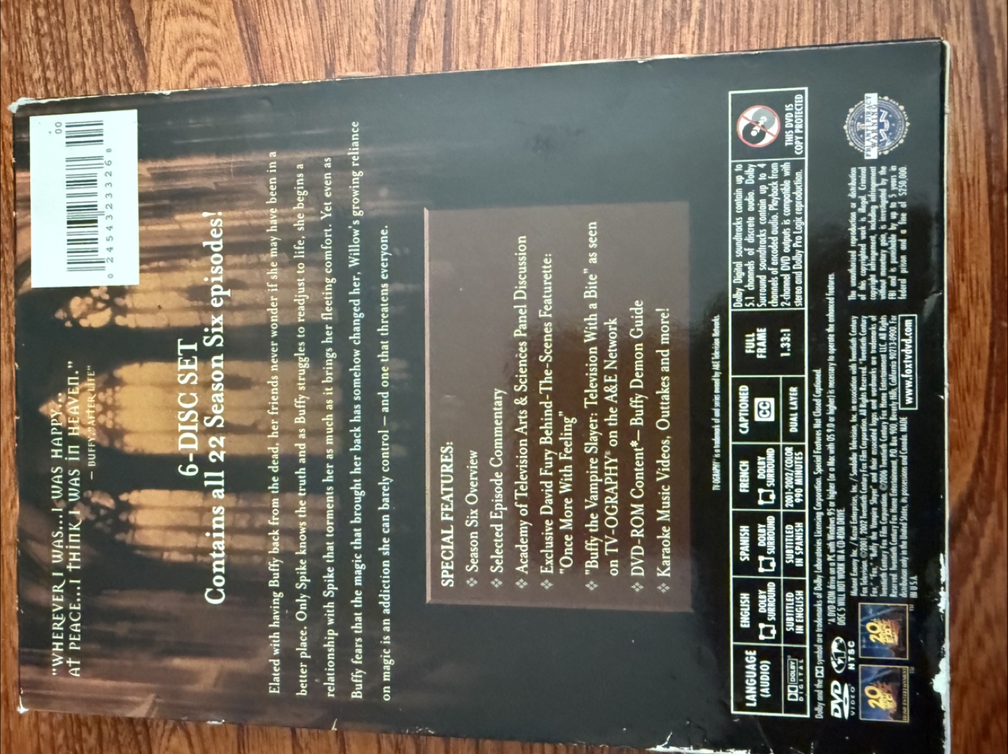 Selling Buffy the Vampire Slayer DVD sets. Seasons 2, 3, 4, 5, and 6 are available. Each set contains 6 discs with all 22 episodes of the season. Great for a Buffy fan!