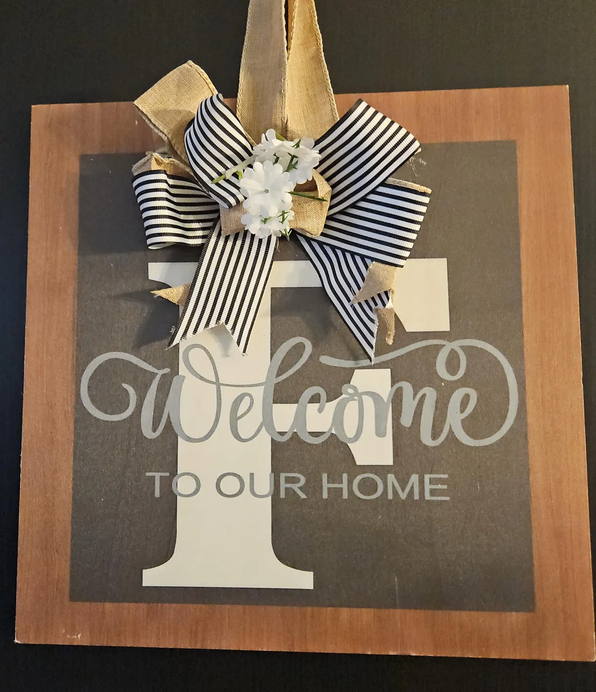 A cute welcome sign for your home! It has a wooden frame with a gray background and a white letter 'F' design. The sign is decorated with a burlap and black and white striped ribbon bow, accented with small white flowers