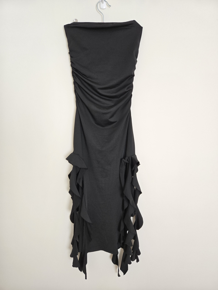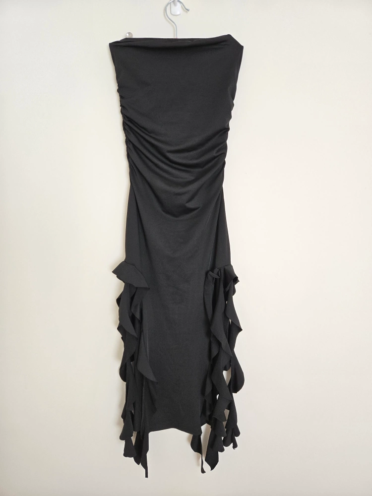 Stylish black strapless dress! It features a unique ruffle hem design that adds a touch of flair. Perfect for a night out or a special occasion, this dress is sure to turn heads