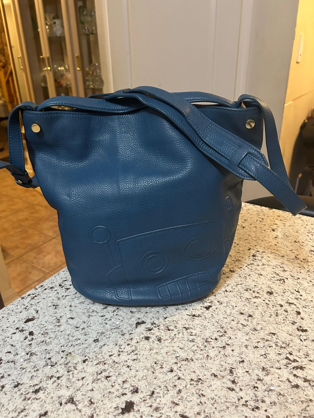 This is a beautiful Opelle bucket bag in a lovely shade of blue. It's made of leather and has a unique design. Perfect for everyday use!