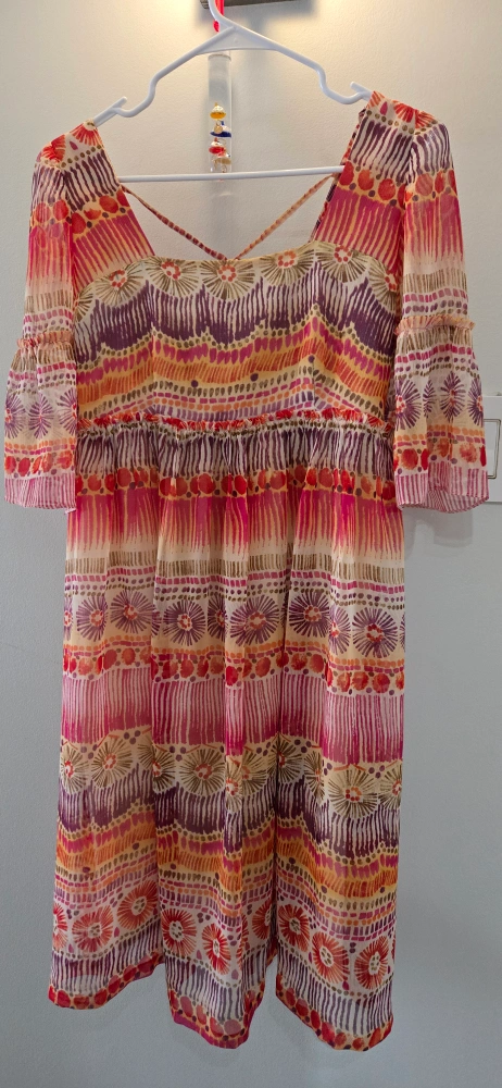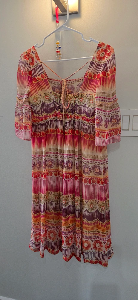 This dress features a vibrant and eye-catching pattern that is handmade with a mix of pink, orange, and purple hues. It has a comfortable fit for pregnancy and is perfect for adding a pop of color to your wardrobe. The lightweight fabric makes it ideal for warmer weather. It's in great condition and ready for a new home!