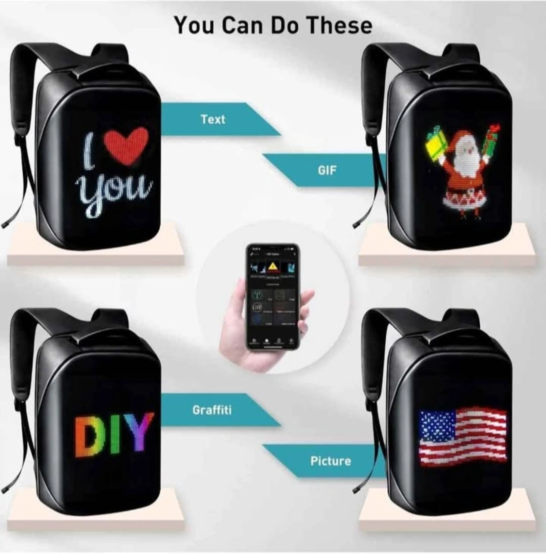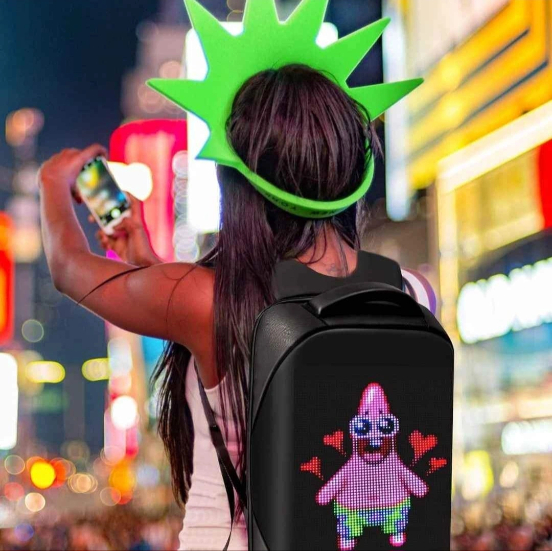This backpack features an LED full-color screen where you can display custom text, GIFs, graffiti, or pictures. It also has multiple pockets for storage, including a laptop pocket, tablet pocket, and mesh pocket. You can connect a power bank to the backpack to power the LED screen