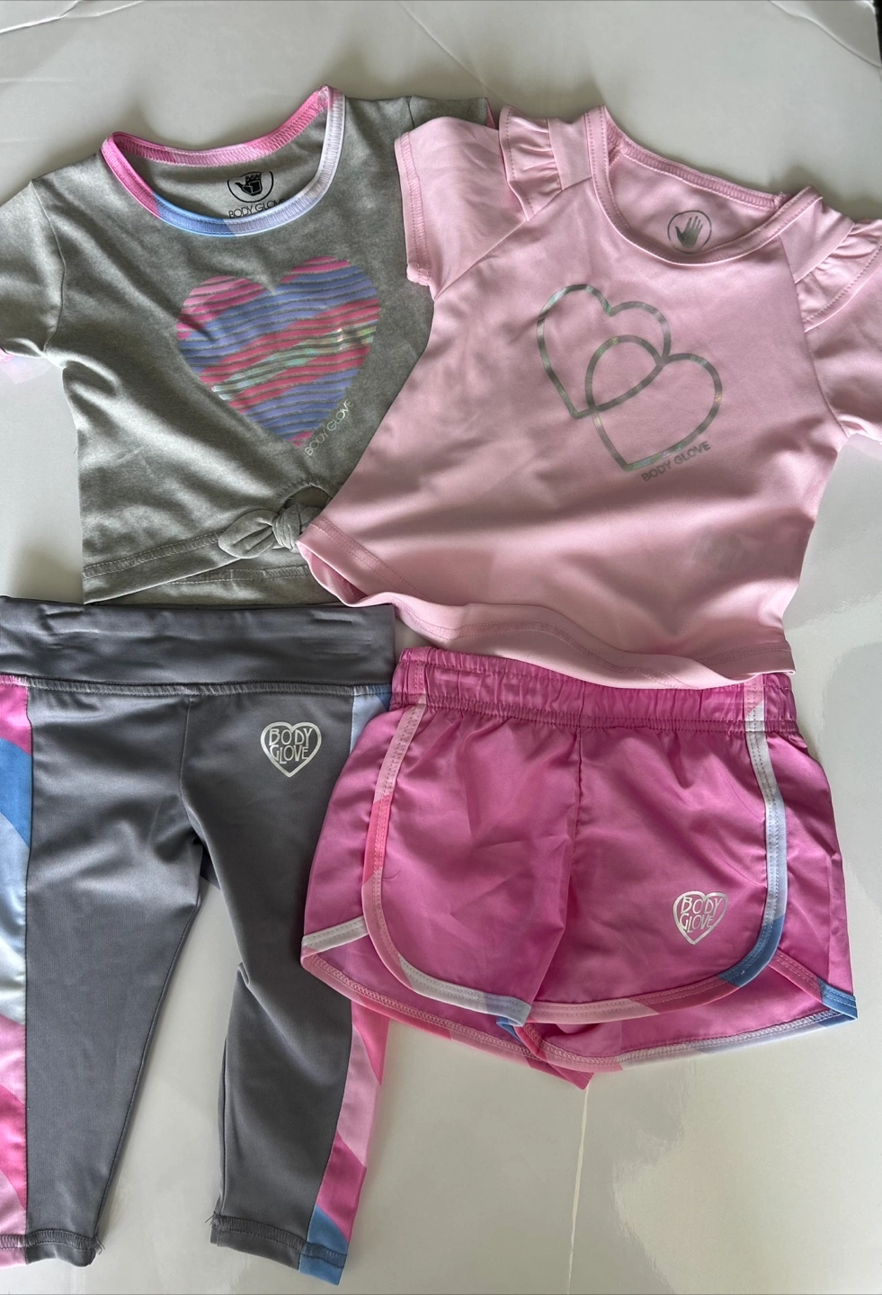 Selling a girls' activewear set from Body Glove! Includes a grey top, pink top, grey leggings, and pink shorts. Perfect for sports or play!