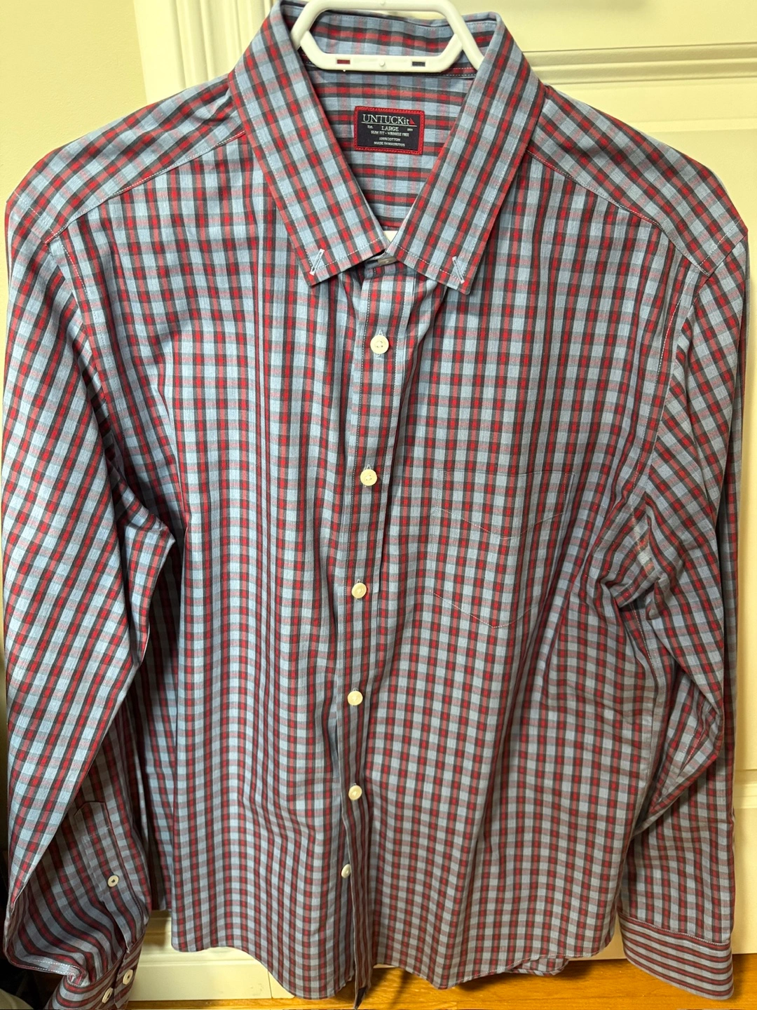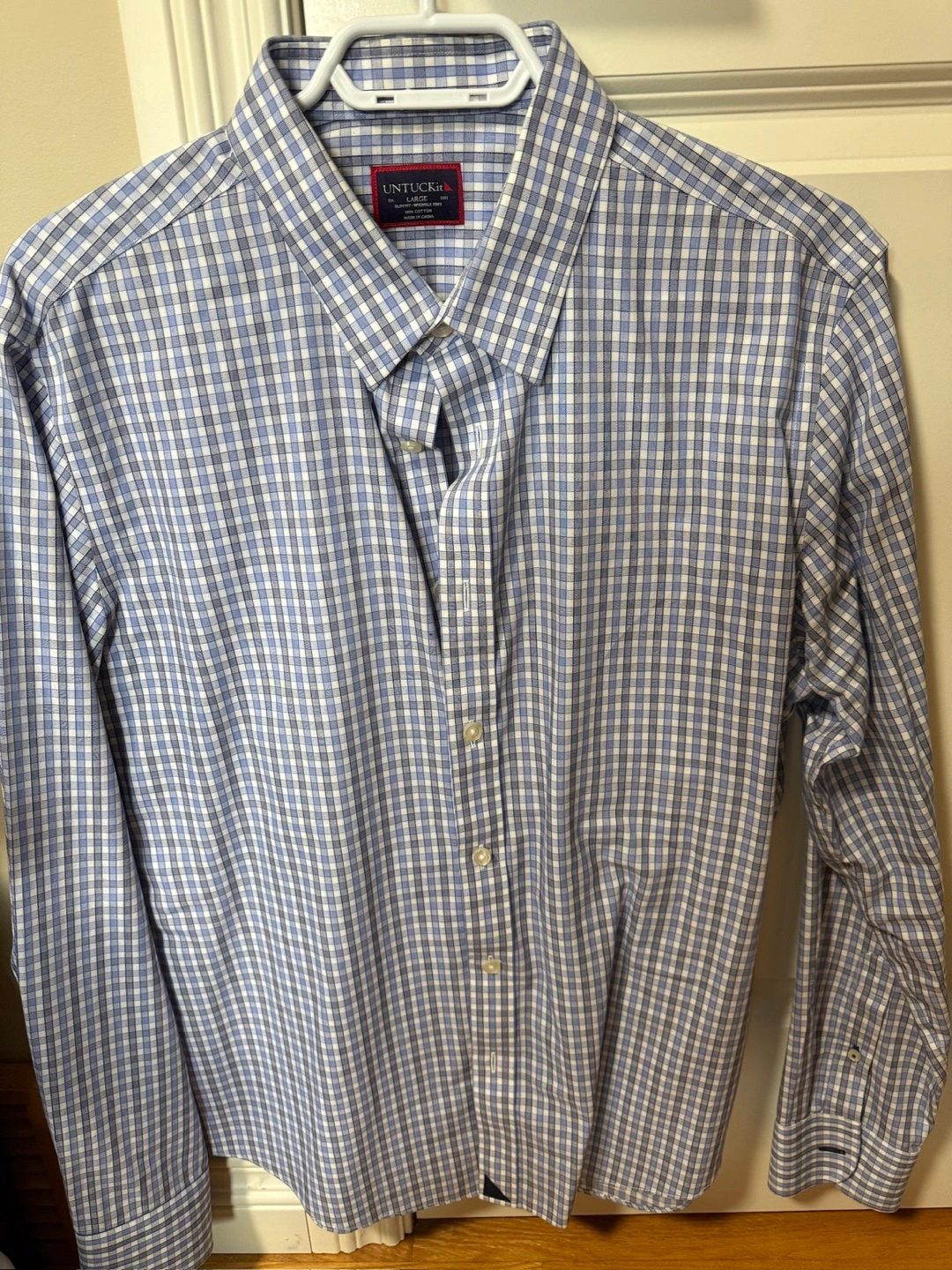 Here's a UNTUCKit button-down shirt! It features a classic plaid pattern, perfect for a casual yet stylish look. The material feels comfortable and breathable, making it great for everyday wear. It's in great condition and ready for a new home! $30 Each