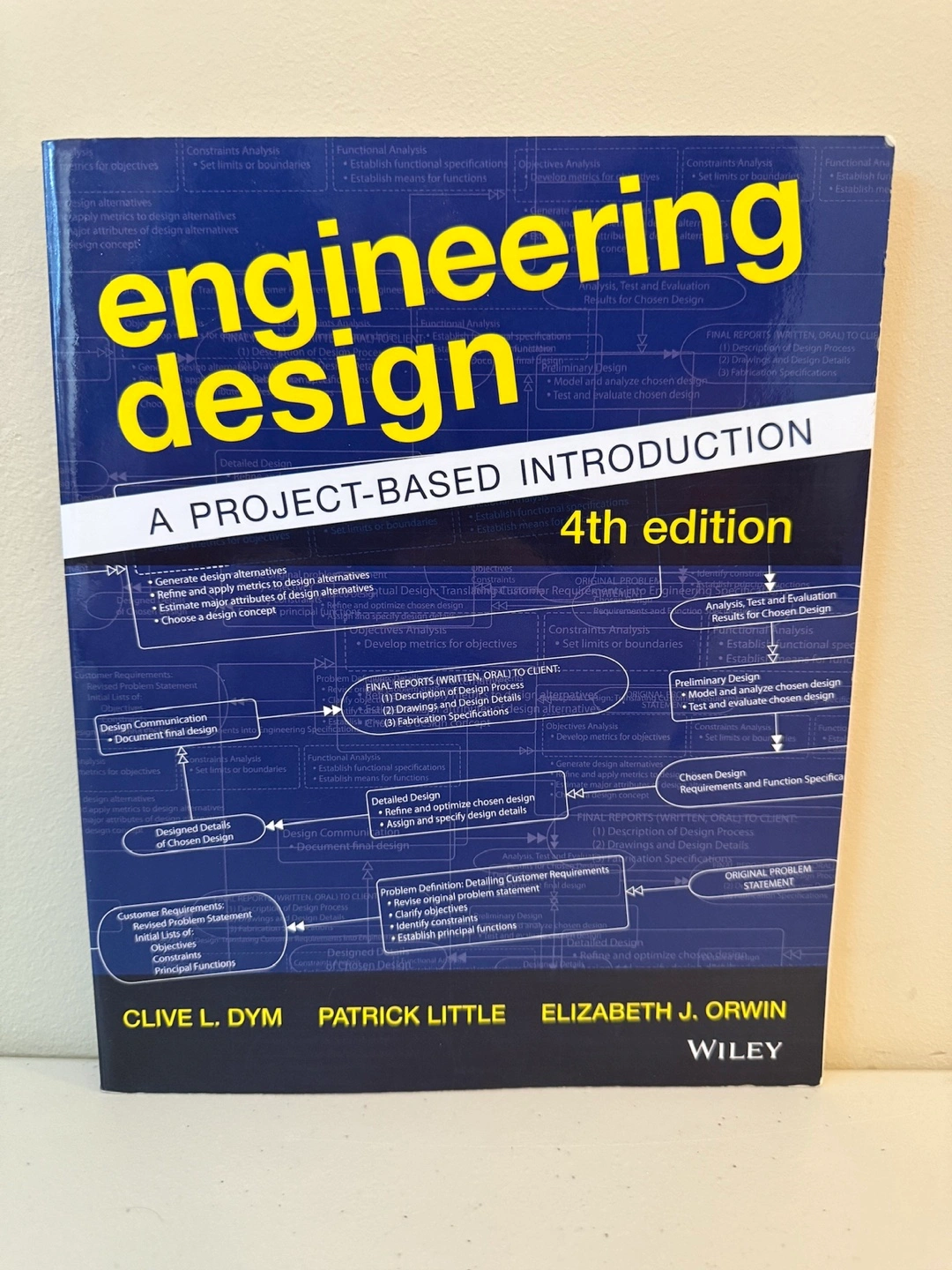 Selling "Engineering Design: A Project-Based Introduction," 4th edition by Clive L. Dym, Patrick Little, and Elizabeth J. Orwin. This book is a comprehensive guide to engineering design principles and practices, perfect for students and professionals alike! It covers a wide range of topics, including constraints analysis, functional analysis, and detailed design processes