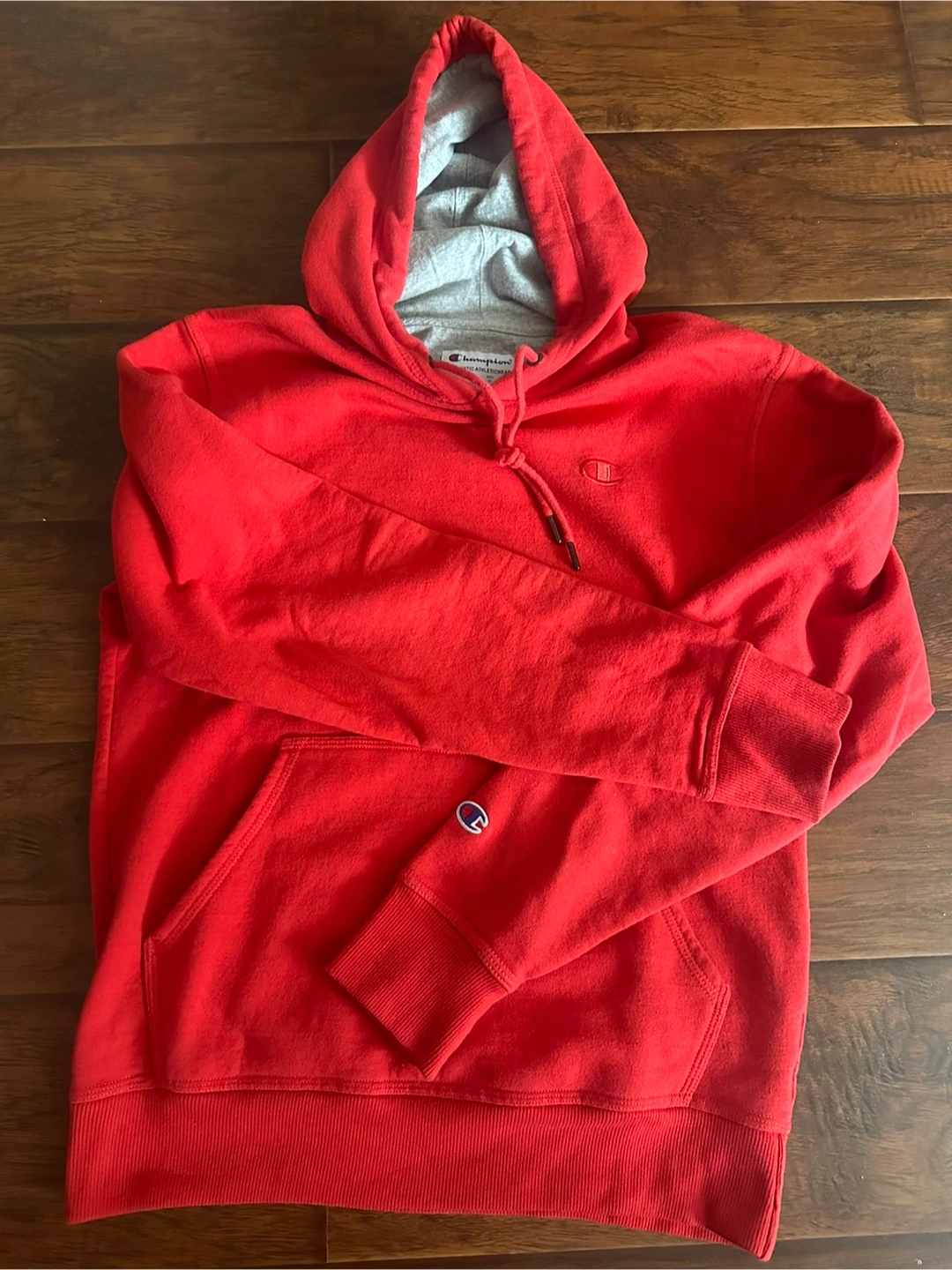 Selling a Champion hoodie in a vibrant red colour! It's a size medium and in great condition. The hoodie features the Champion logo on the chest and sleeve. Perfect for staying cozy and stylish!