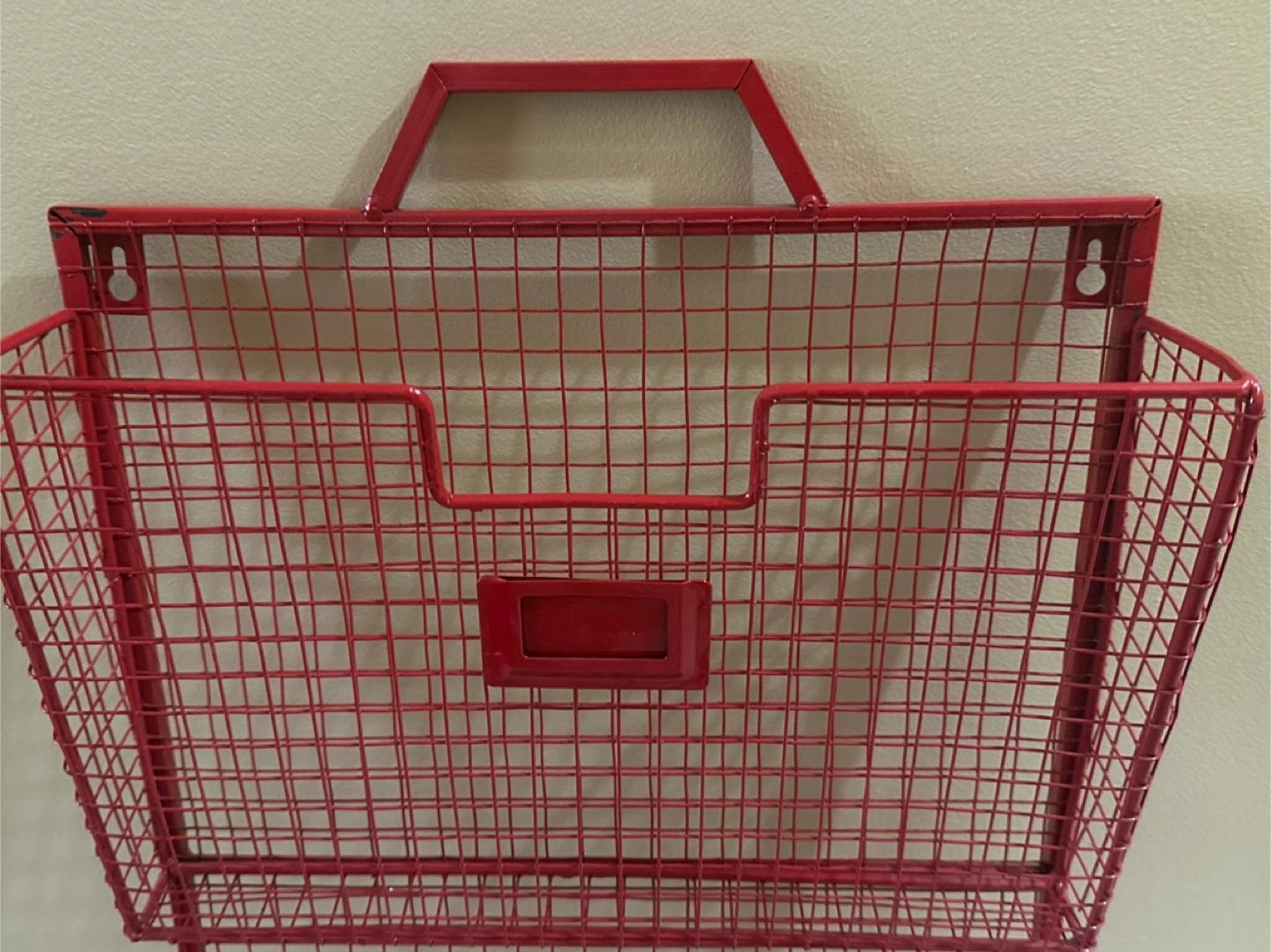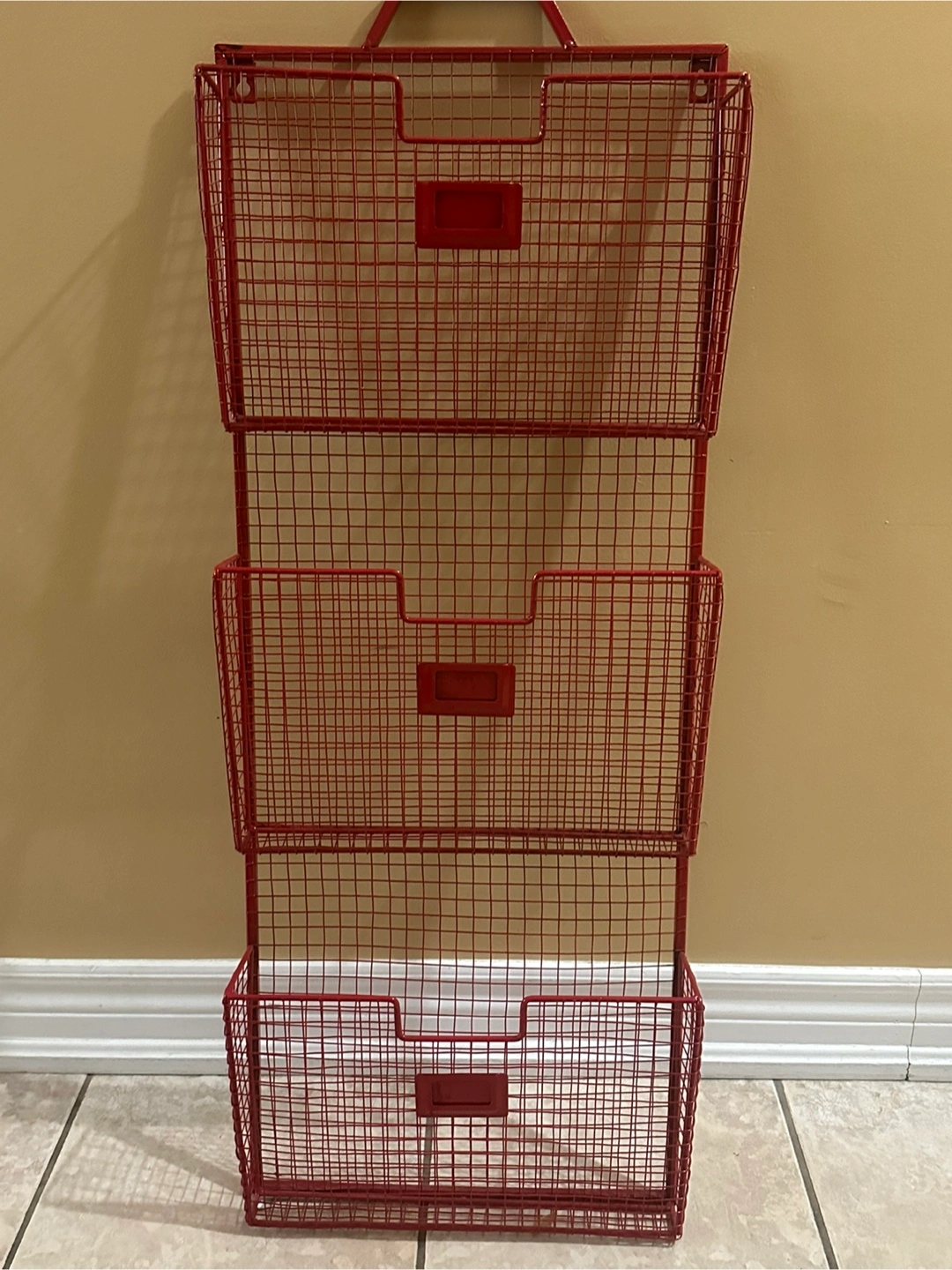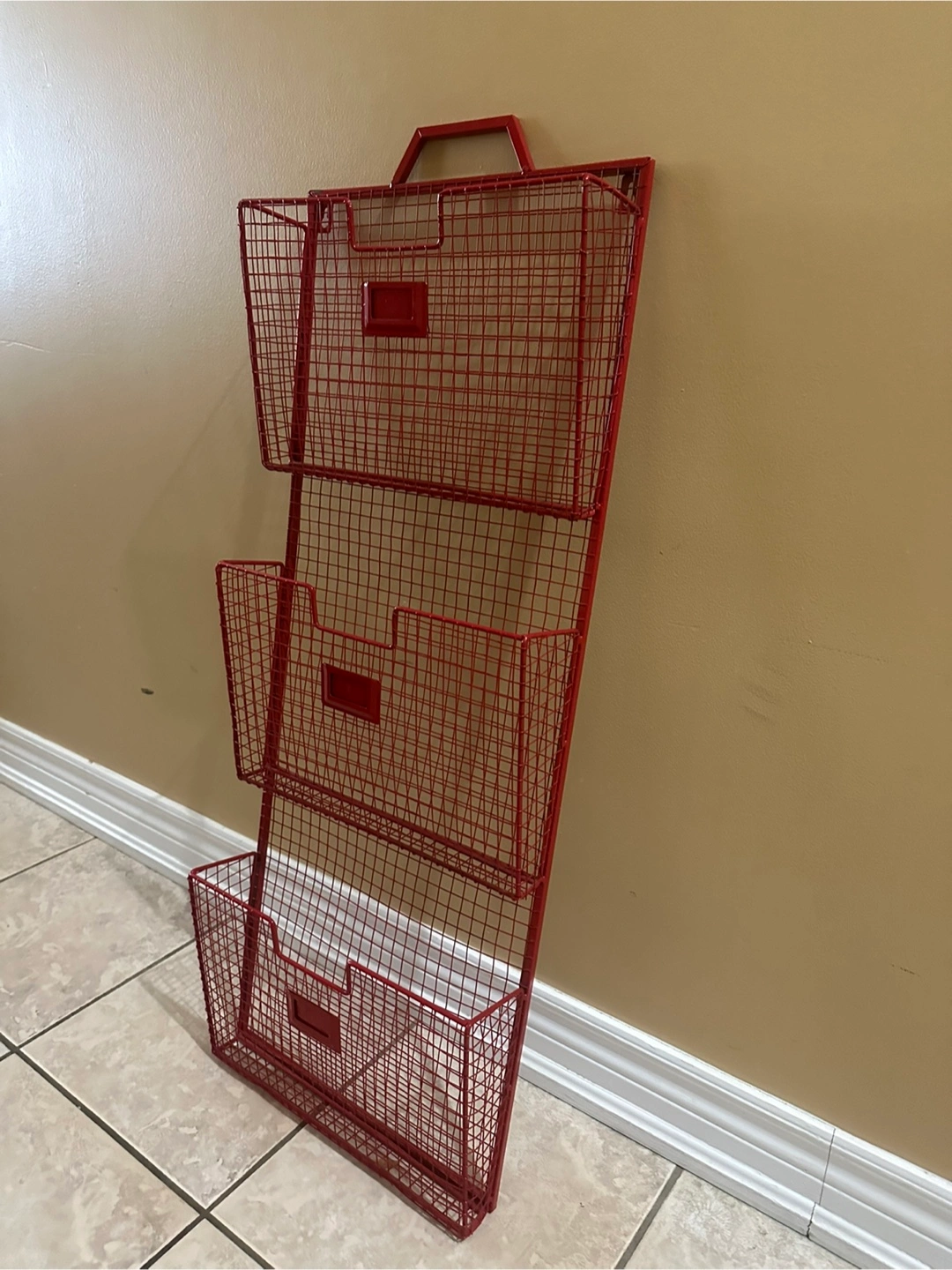 Keep your space tidy with this red metal wire wall basket organizer! It features three tiers of baskets, perfect for storing mail, magazines, or other items. Great for adding a touch of vintage charm to your home or office. Also, perfect for classrooms!