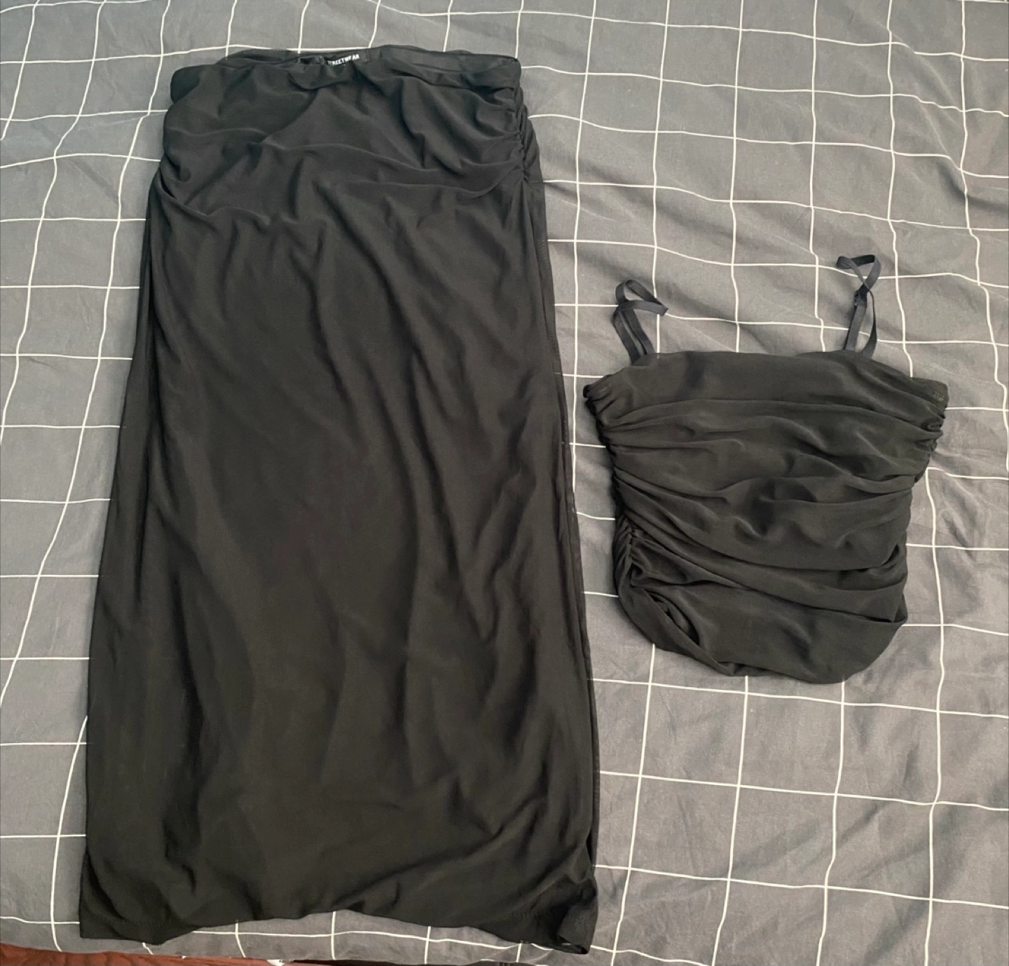 Selling a cute matching black top and skirt from Streetwear Society! The top is a size small and the skirt is a size large - in great condition. Perfect for a night out or a casual day.