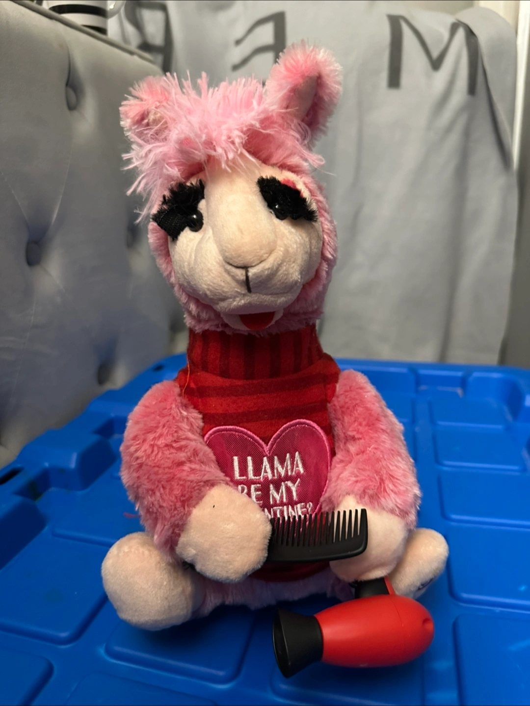 201This adorable pink llama plush is ready for Valentine's Day! It's wearing a cute red sweater with a heart that says 'Llama Be My Valentine?' It also comes with a comb and a toy hair dryer for styling its fluffy pink hair. Perfect for a gift or just to brighten someone's day!