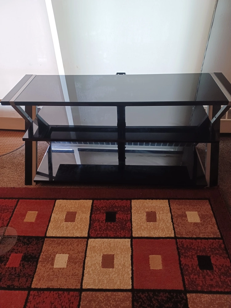 Selling a sleek black TV stand with a glass top and two shelves. It has a modern design with an X-shaped frame. Perfect for your living room setup!