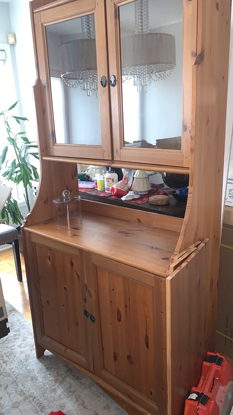 Selling a wood hutch cabinet. There are some minor scratches on the wood. Please see the pictures for details and measurements