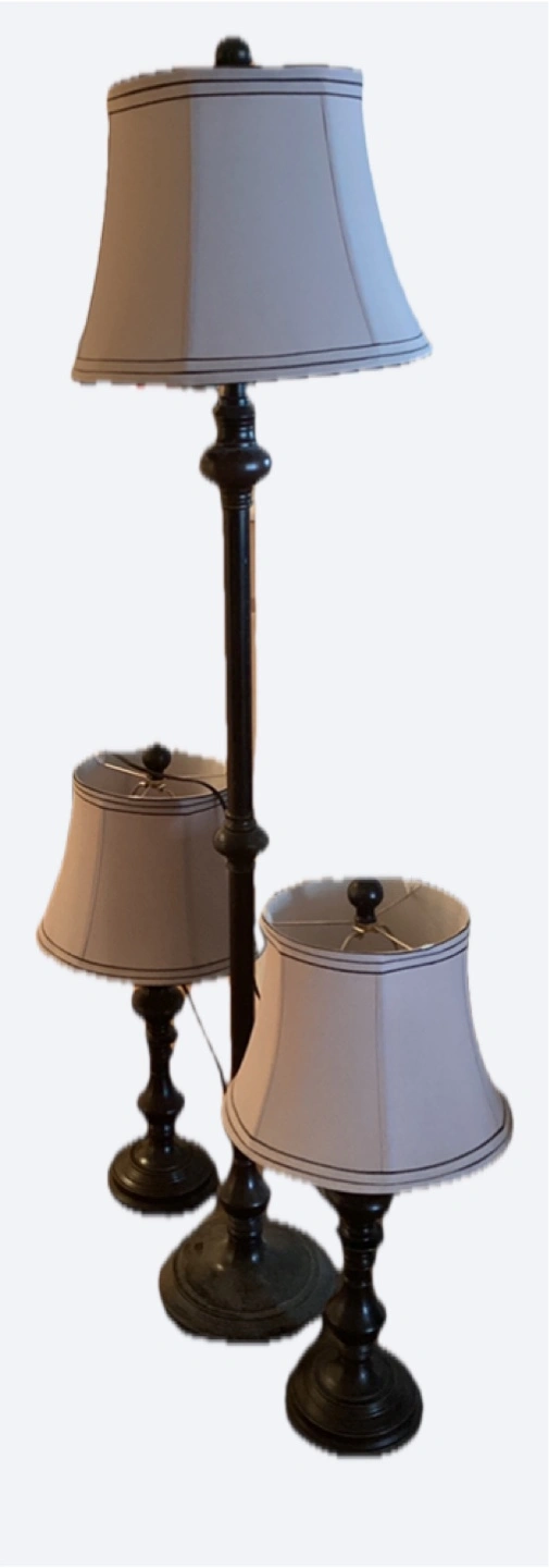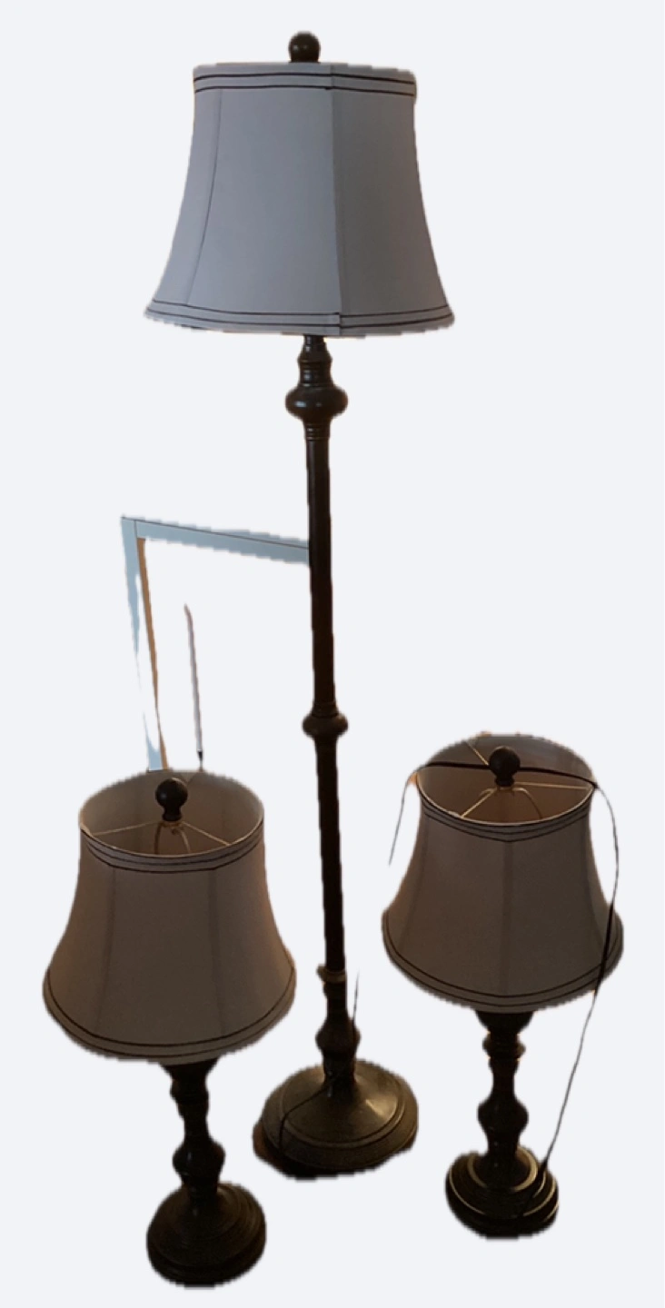 Selling a set of lamps including one floor lamp and two table lamps. They have a classic design with a dark base and light-coloured shades. Perfect for adding some extra light to any room in your home