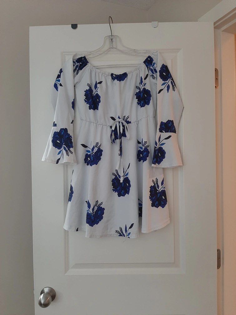 Cute white tops with a blue floral pattern! It's an off-the-shoulder style Perfect for spring or summer