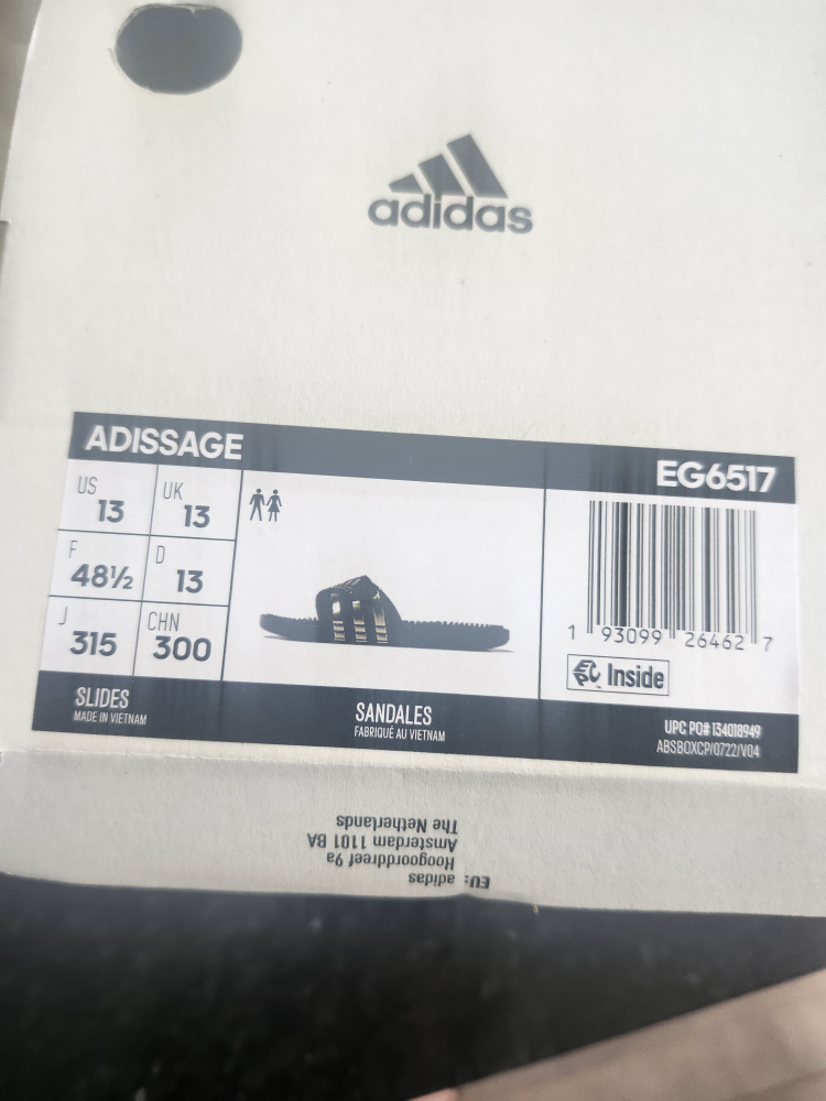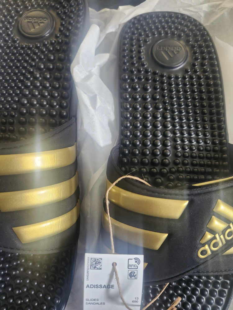 These Adidas Adissage slides are brand new and ready for a new home! They're a US size 13 and feature a stylish black and gold design. Perfect for relaxing after a workout or just kicking around town