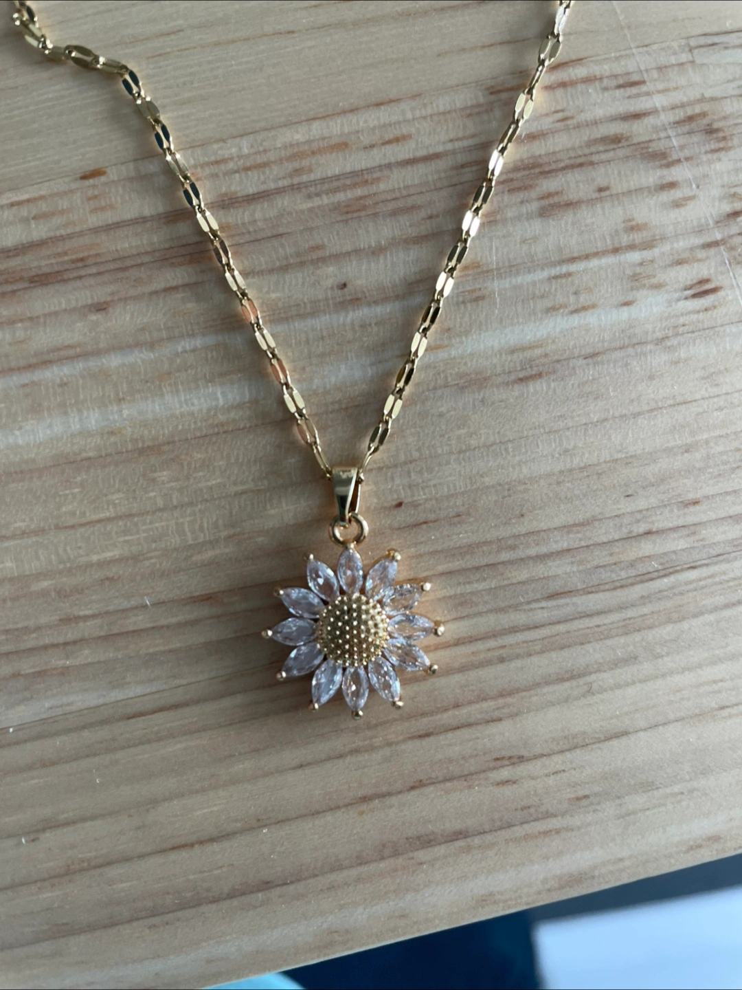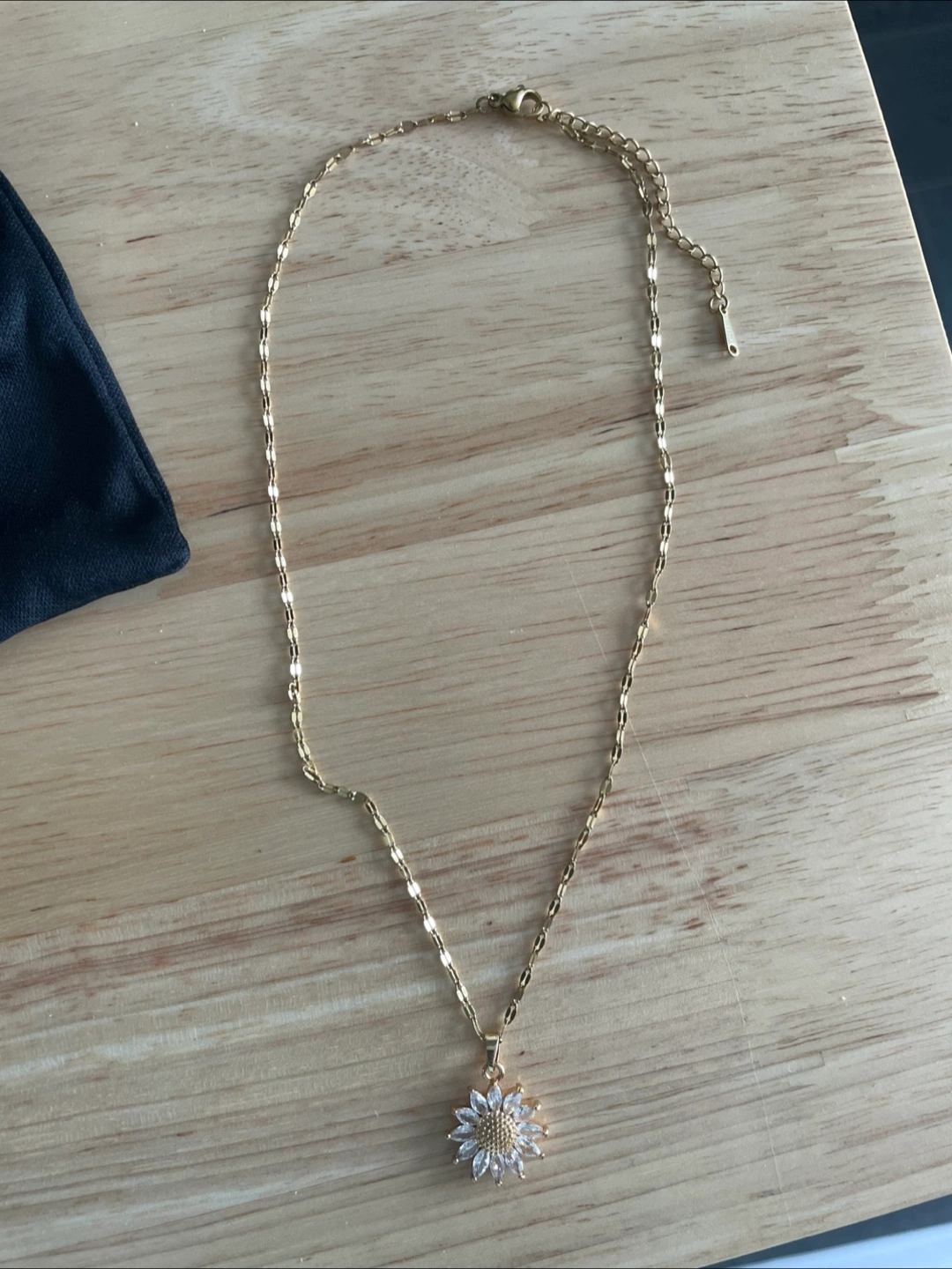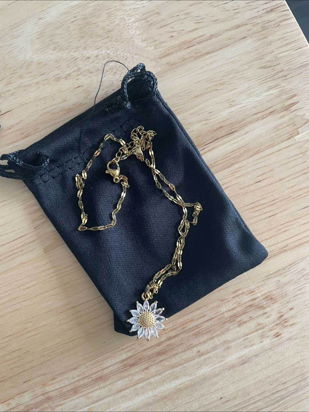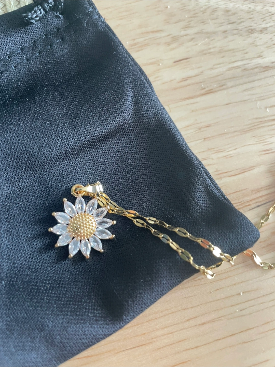 Gold necklace with a sunflower pendant. The sunflower has clear stones around the centre. It comes with a black drawstring pouch. Aprox 6 inches