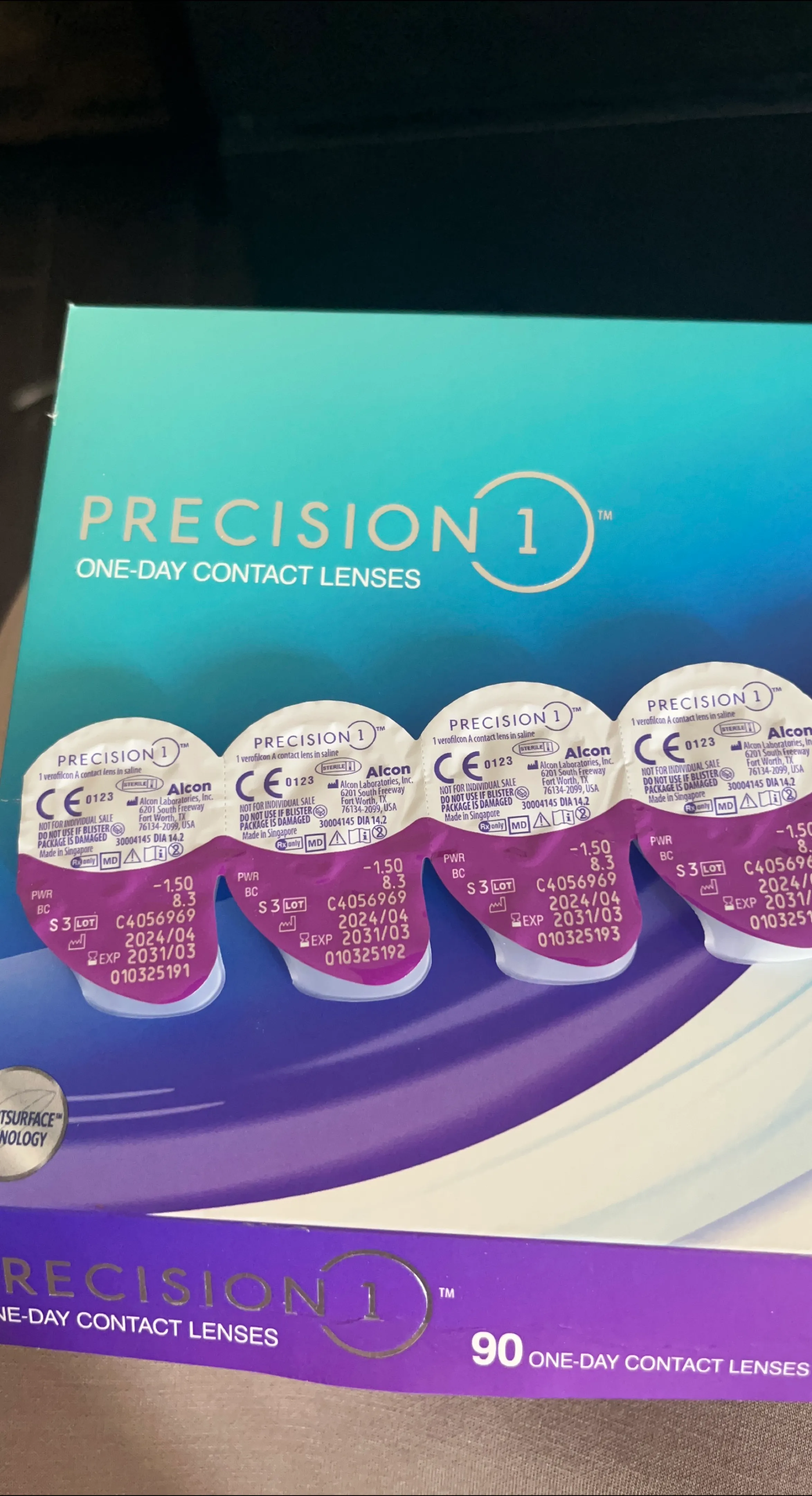 Selling Precision 1 one-day contact lenses. Each lens is 1 verofilcon A contact lens in saline. 80 pieces left in box of 90.