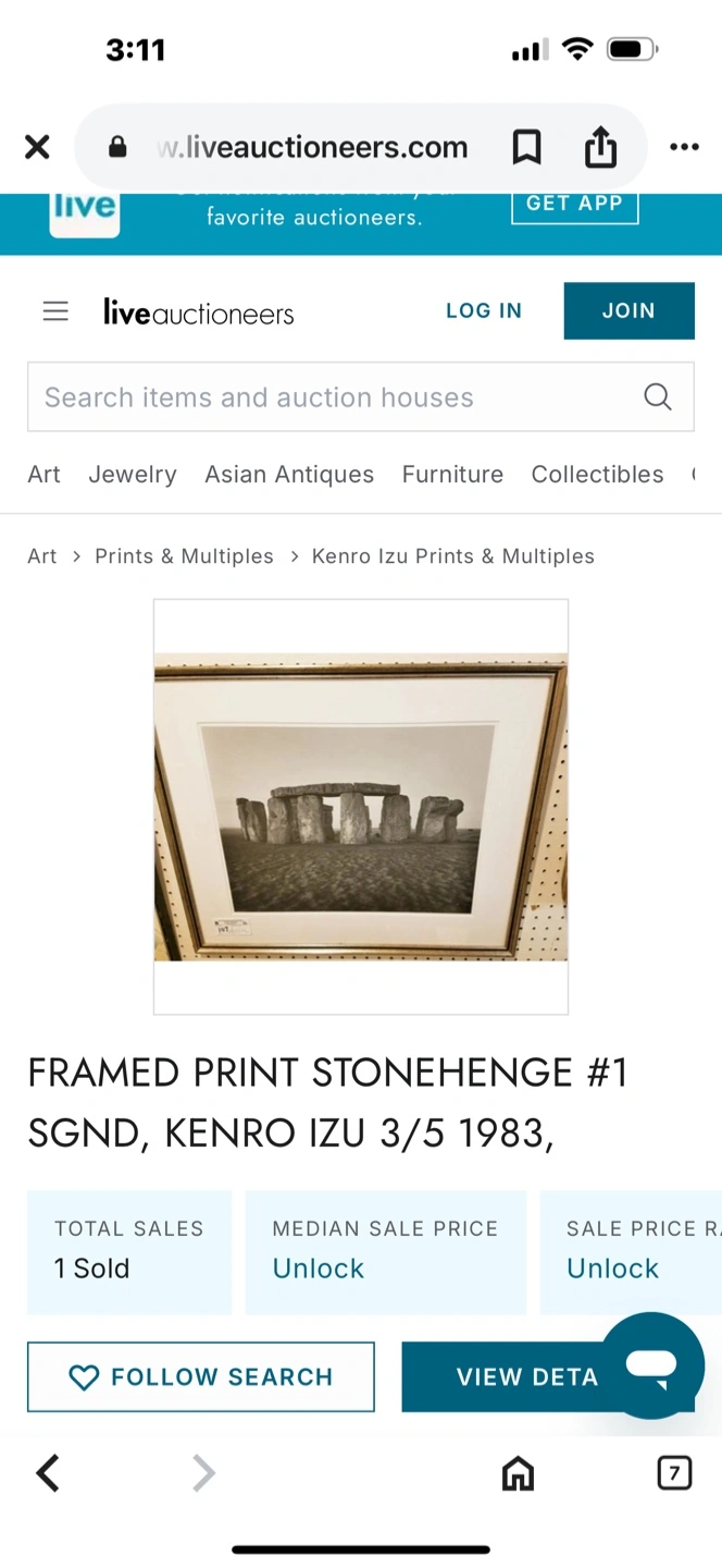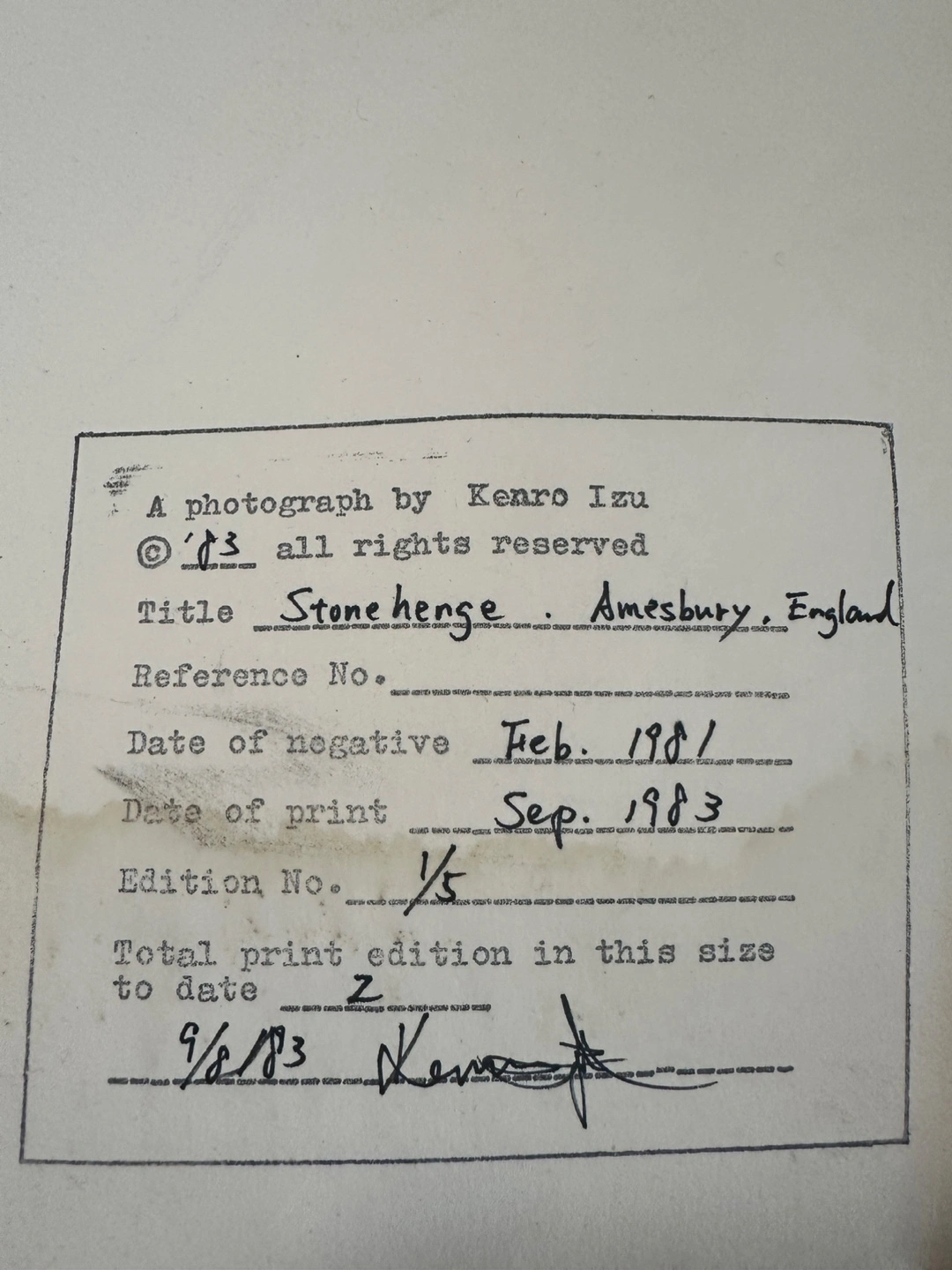 A vintage photograph by Kenro Izu Stonehenge signed by him little water damage but in great condition print 1/5 September 1983 date of negative February 1981 total print of this addition 2 pick up or meet cash only BX
