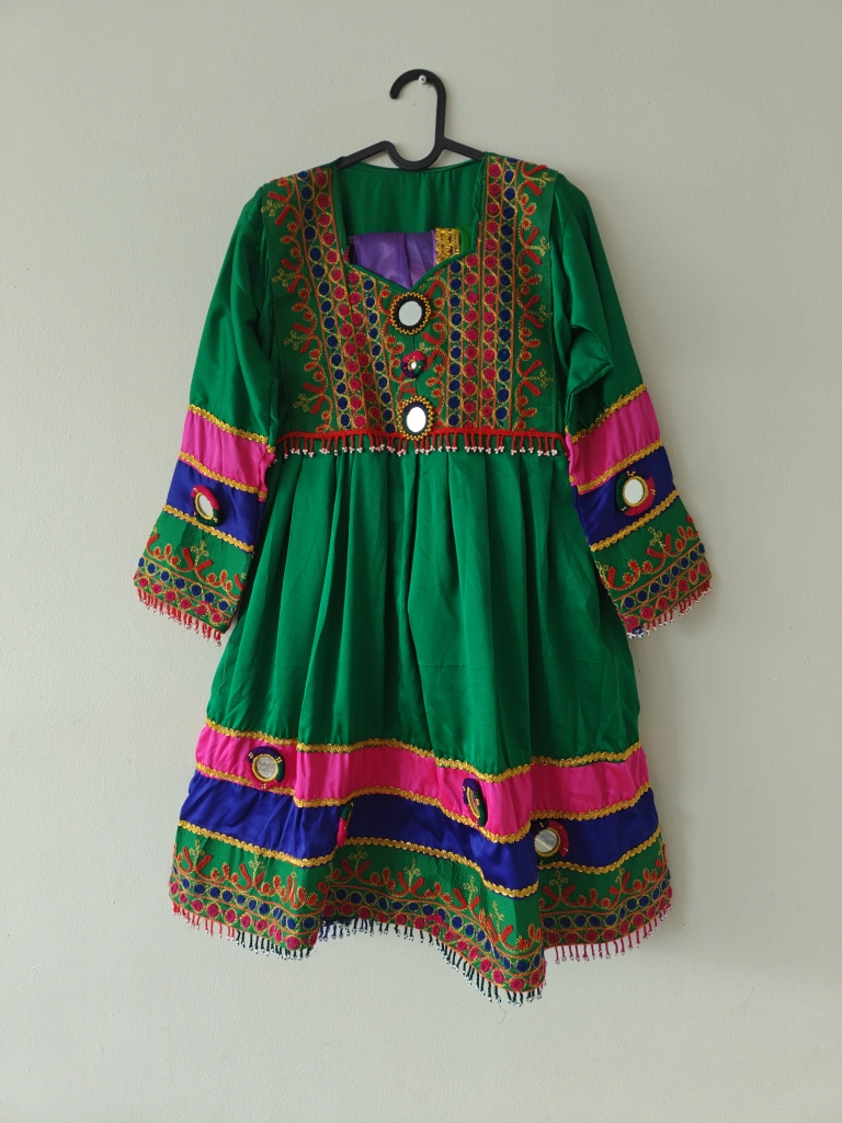 Beautiful green Afghan dress and pants set! The dress features colourful embroidery and mirror accents, while the pants have matching embroidery at the bottom. The set also includes a colourful scarf with gold trim. Perfect for cultural events or celebrations