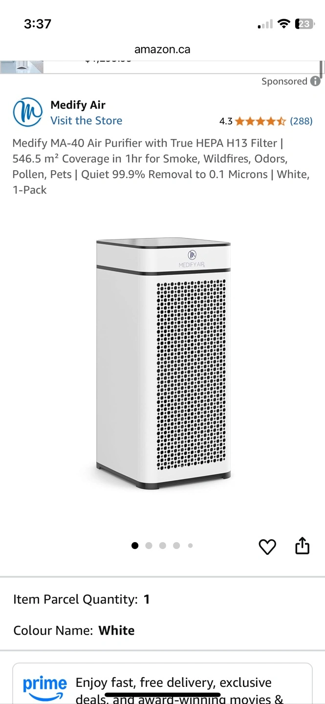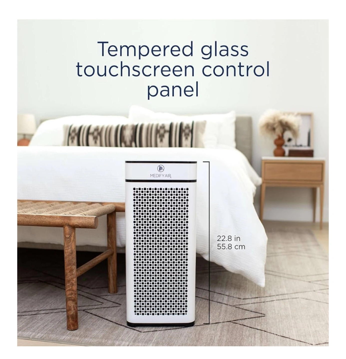 Selling a Medify Air MA-40 Air Purifier in white. It has a True HEPA H13 filter. This air purifier can remove 99.9% of particles to 0.1 microns. It's great for smoke, wildfires, odours, pollen, and pets. It also has a 3-stage filtration system with a pre-filter, true HEPA filter, and active carbon composite filter.
