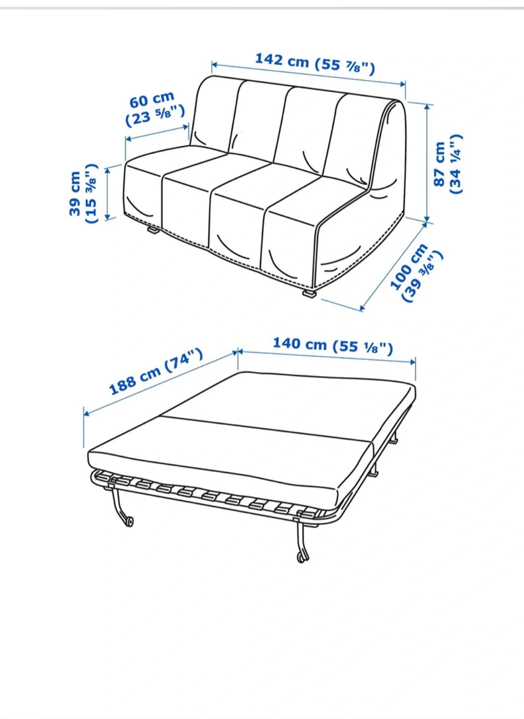 - Sofa: 142 cm (55 7/8") wide, 87 cm (34 1/4") high, and 100 cm (39 3/8") deep