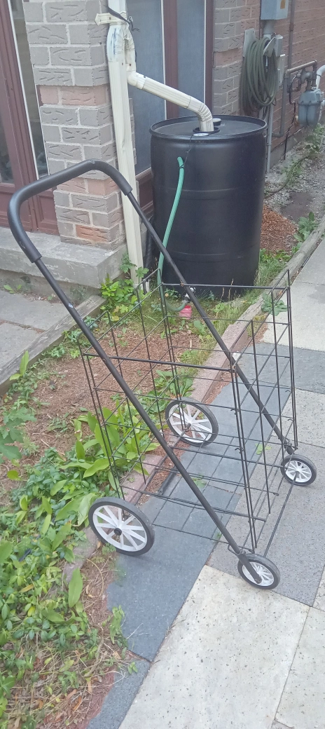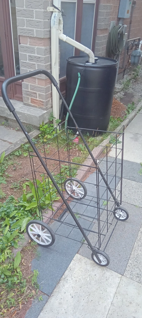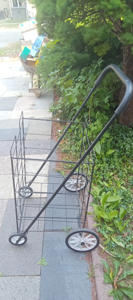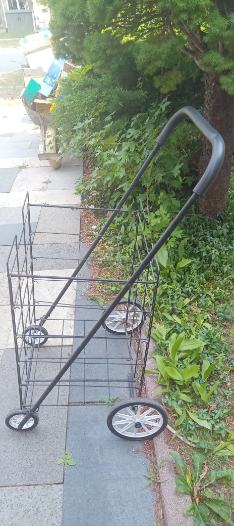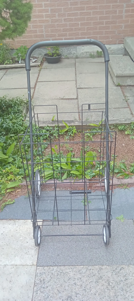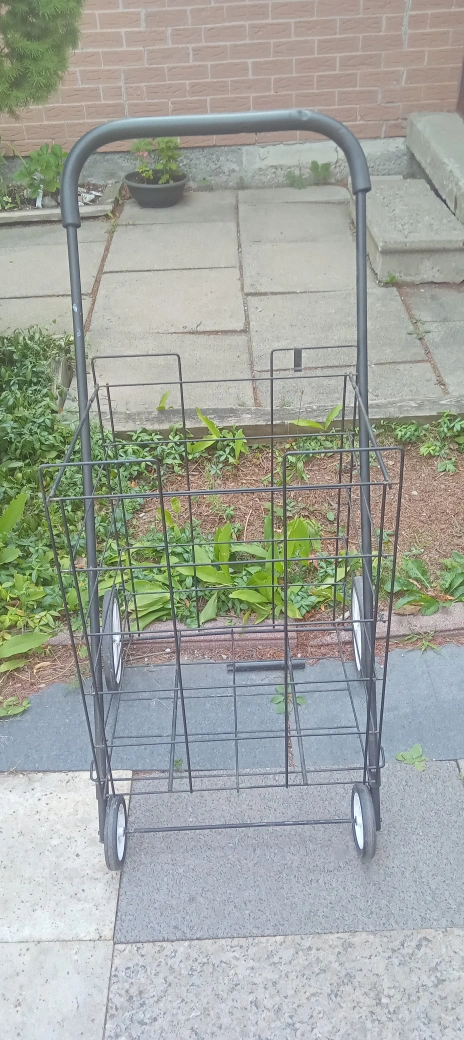 Selling a used folding shopping cart. It's black and made of metal wire. Great for groceries, laundry, or carrying other items. Folds up for easy storage!