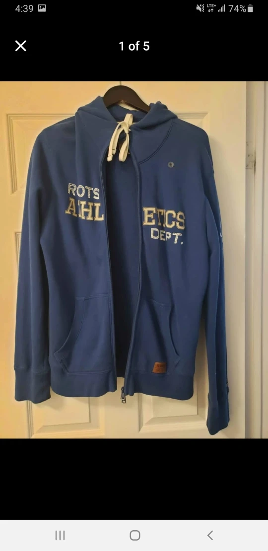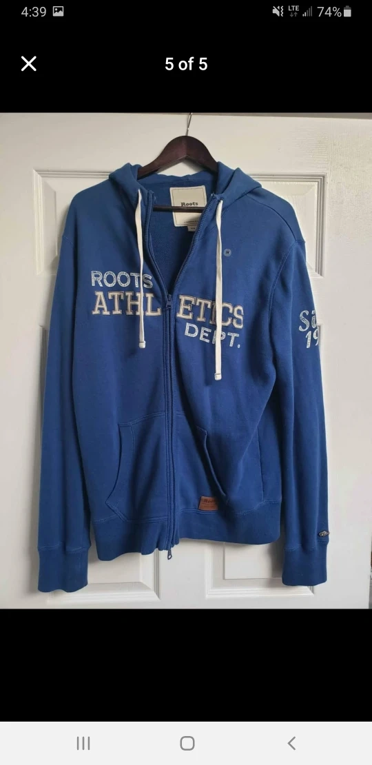 Cozy Roots Athletics Department zip-up hoodie in a nice blue colour! It's a size medium and features a full zip, drawstring hood, and front pockets. Perfect for layering or wearing on its own! New lost tags. Asking $ 49 OBO