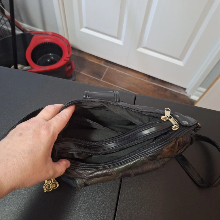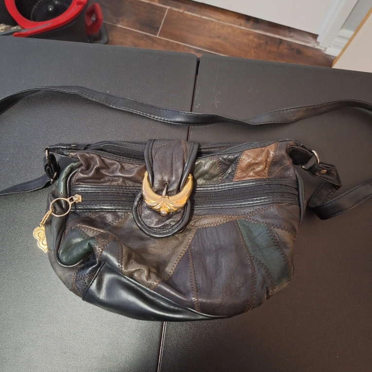 34This is a unique patchwork leather shoulder bag! It has a zipper closure and a long shoulder strap. The bag is in good condition with some signs of wear, adding to its vintage charm