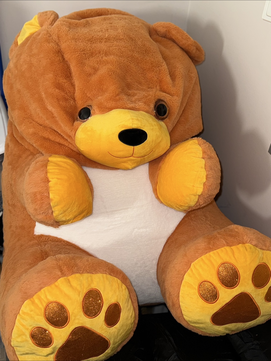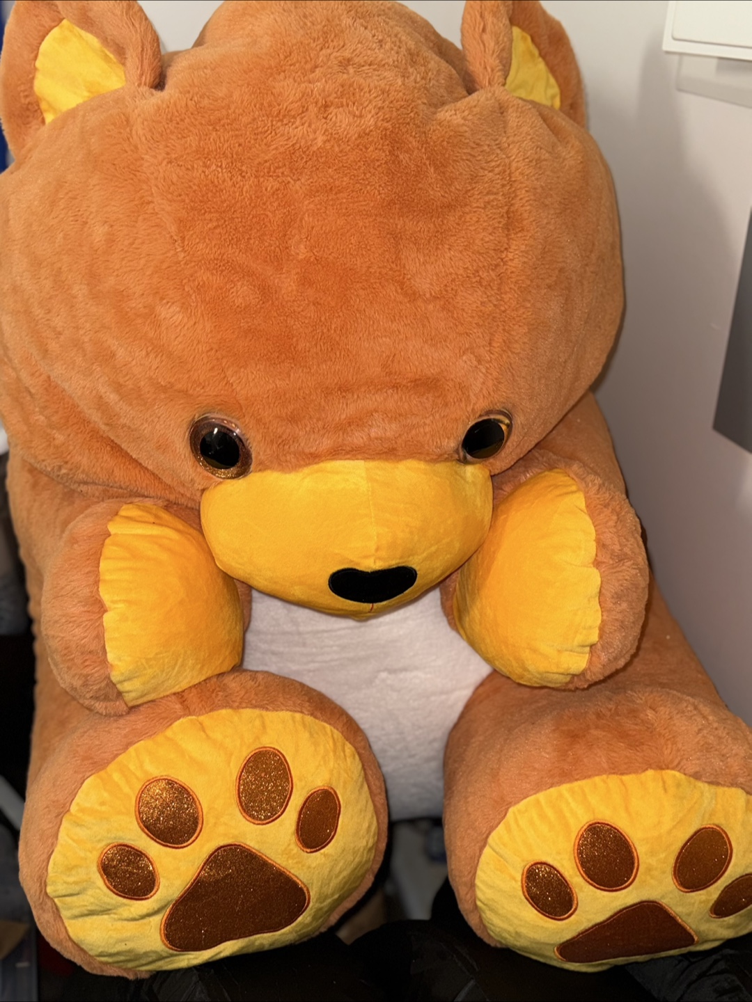 Meet Harper. a big, cuddly brown teddy bear! It's in great condition and ready for a new home. Perfect for snuggling or as a fun decorative piece. He has a soft brown colour with yellow accents on the paws and ears and a great size for kids and adults alike!
