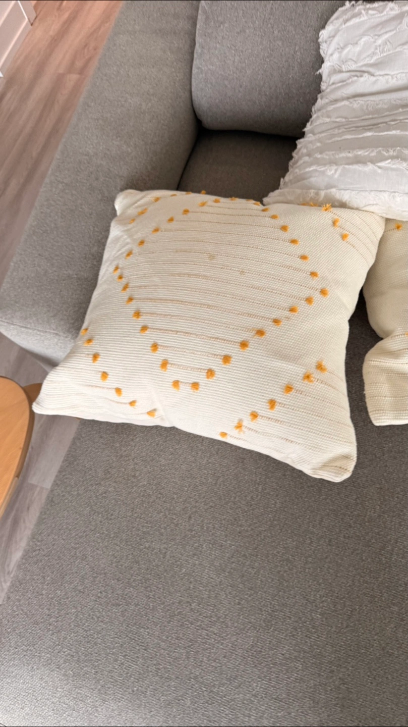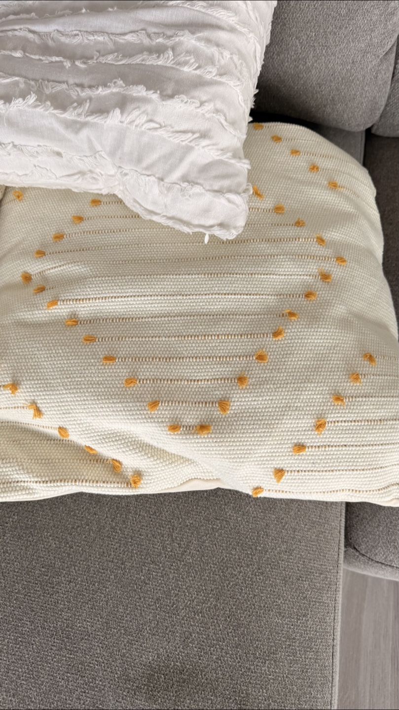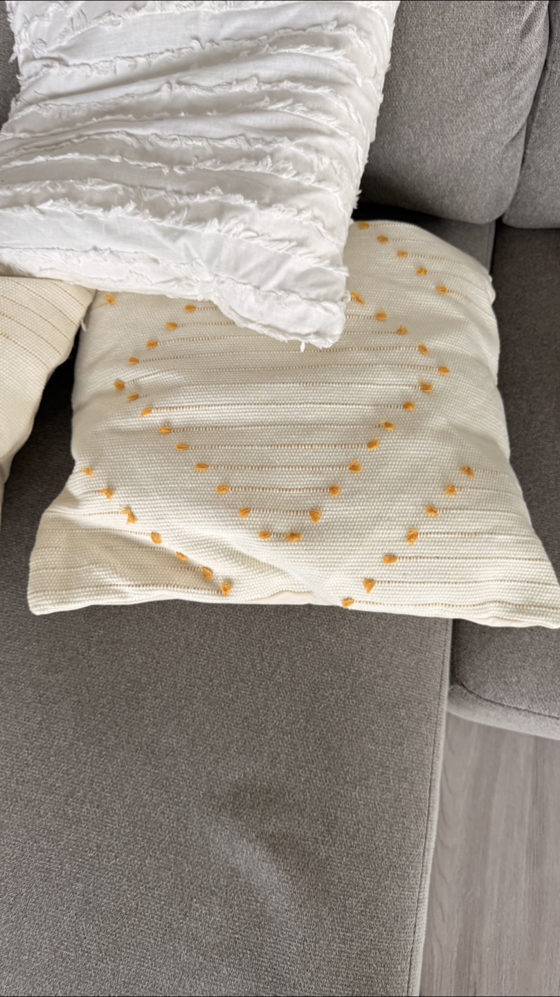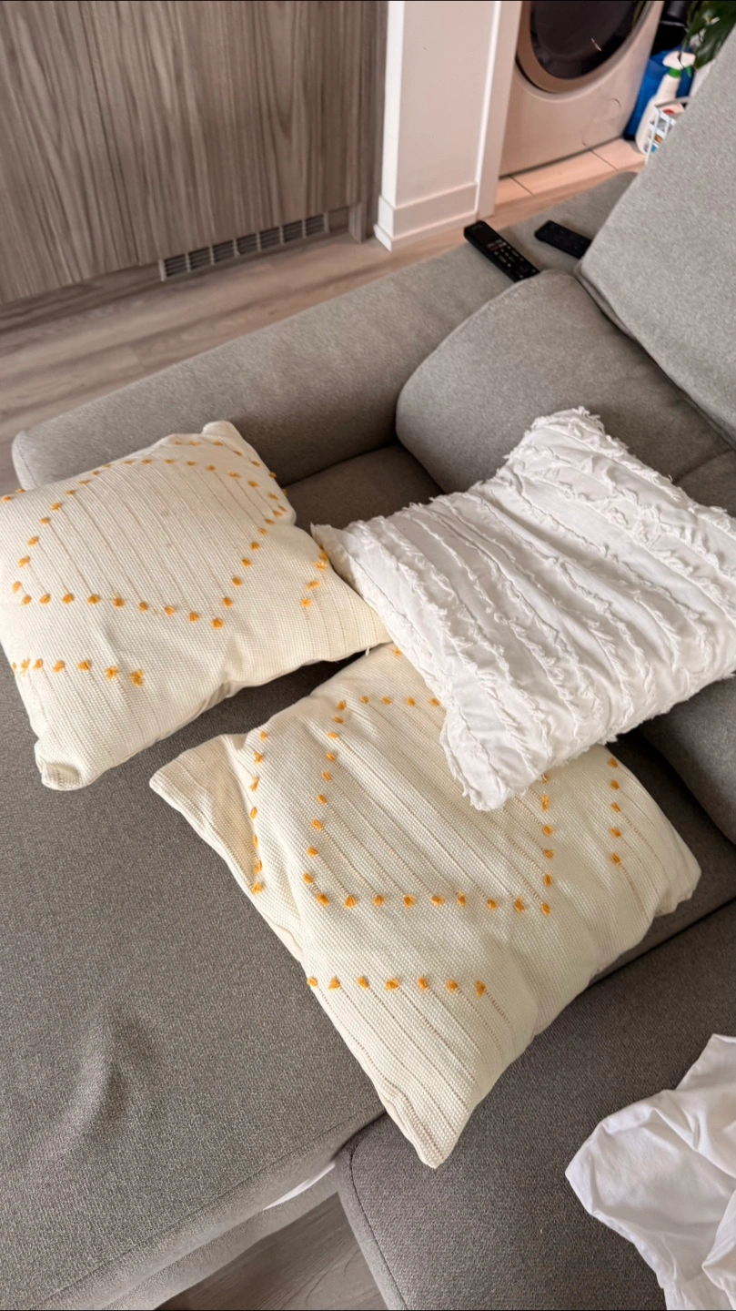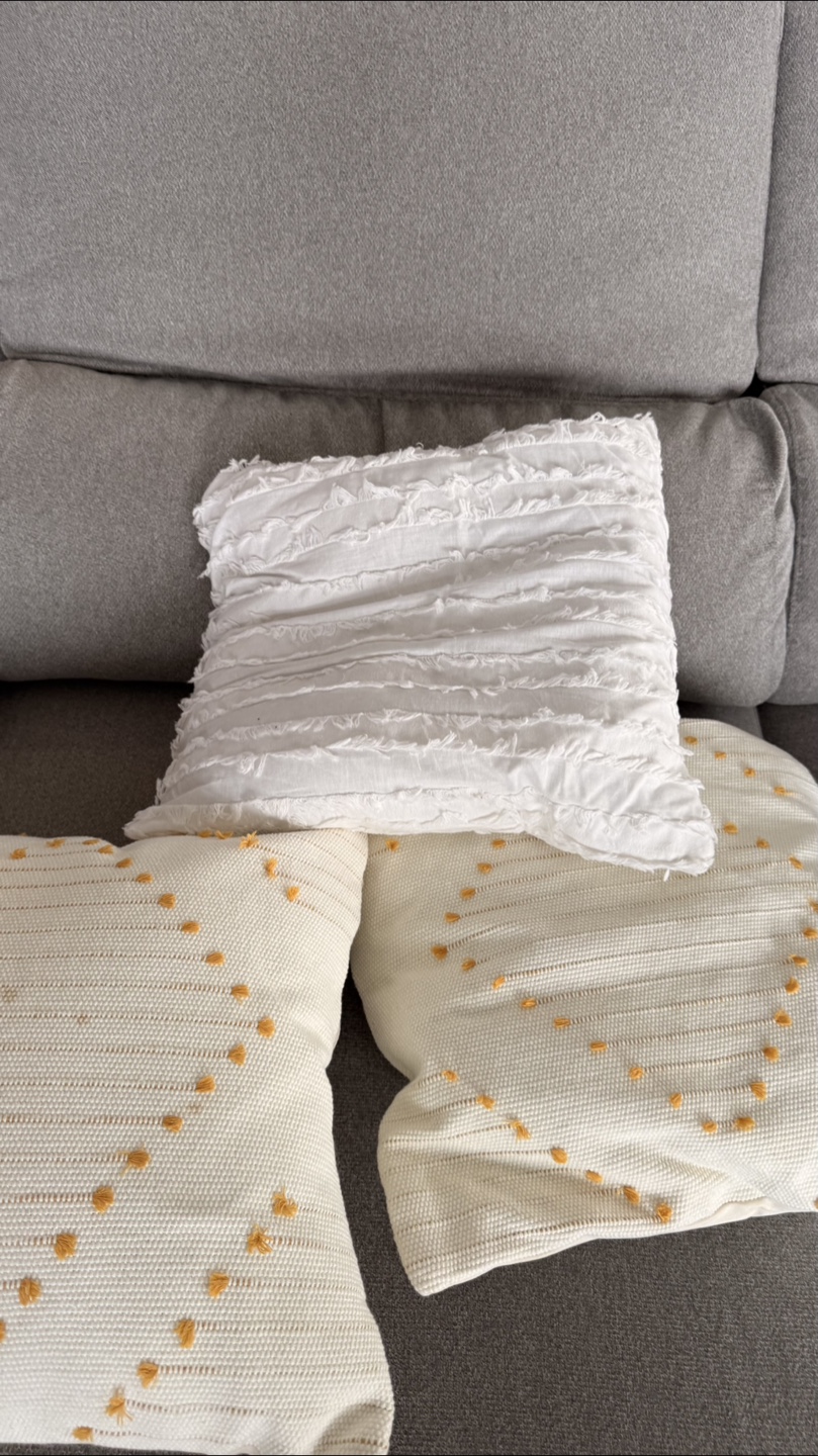 Giving for free a set of three decorative throw pillows. Two are off-white with a dotted pattern, and the third is white with a textured design. They'd look great on a couch or bed!