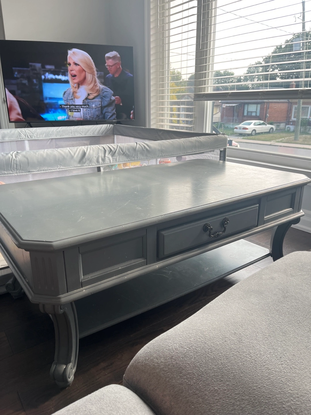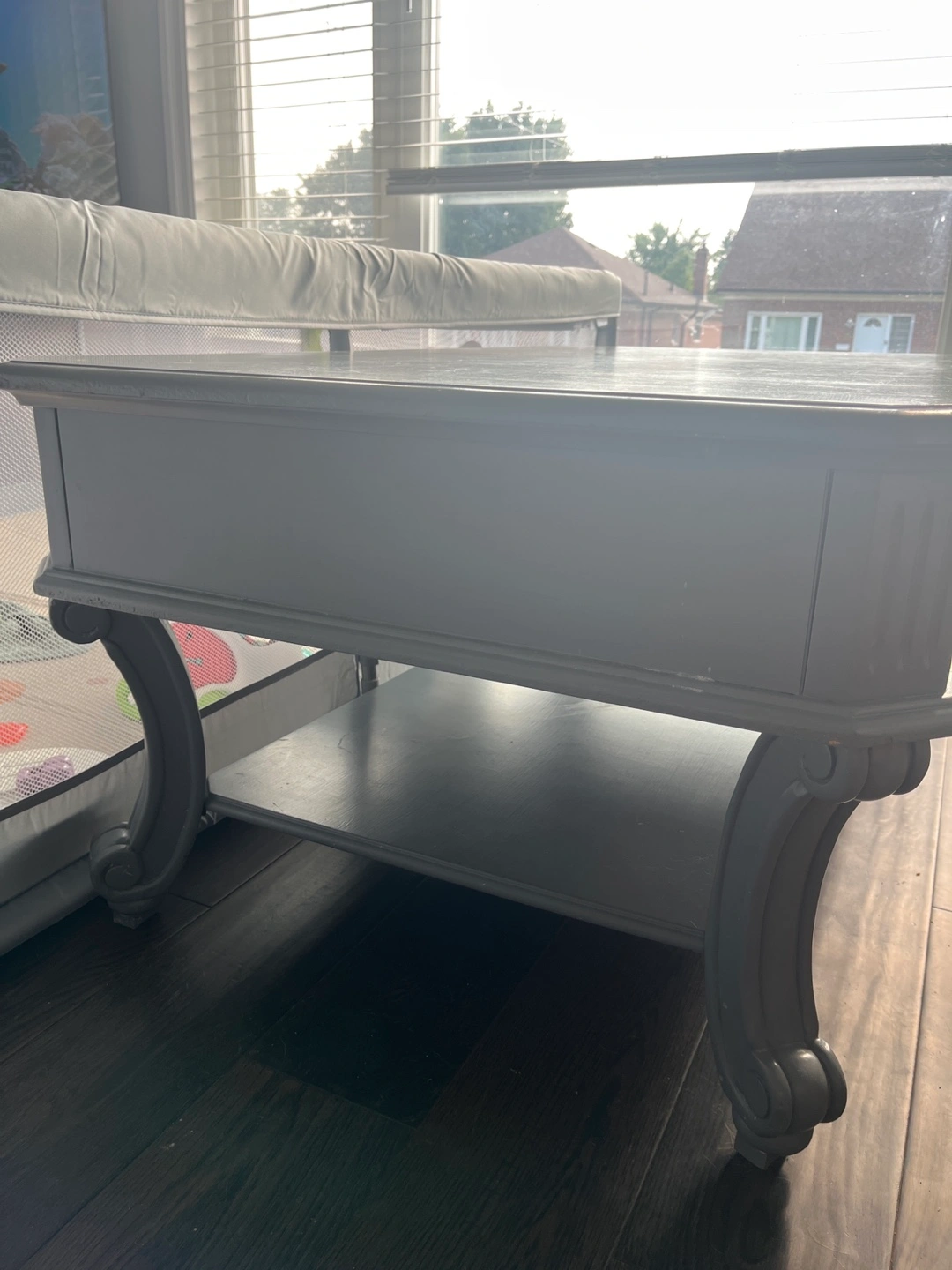 Selling a grey coffee table with a drawer. It has a classic design with curved legs and a lower shelf for storage.