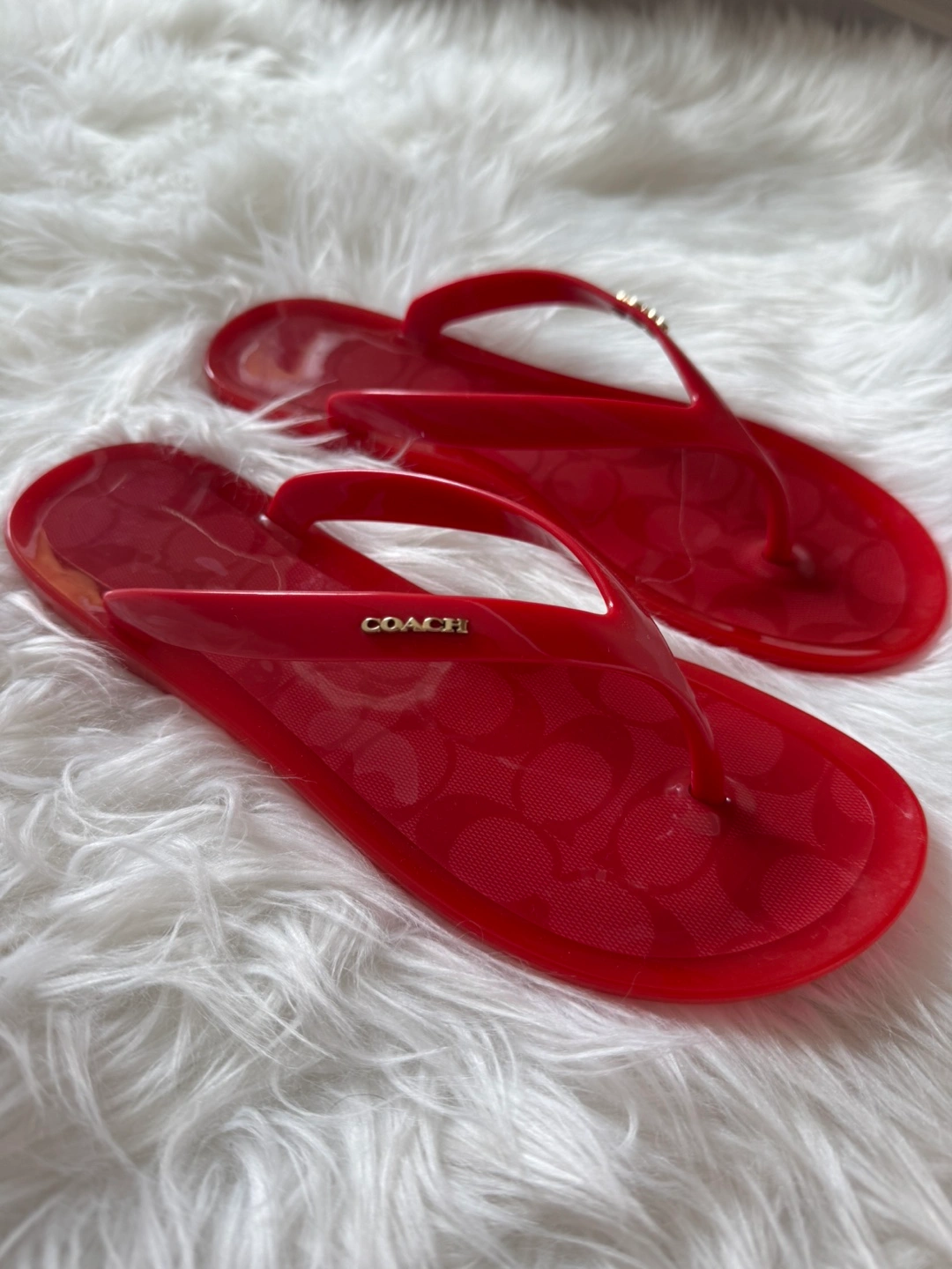These are a pair of Coach red jelly thong sandals! They are in great condition and would be perfect for the summer weather. Size 37
