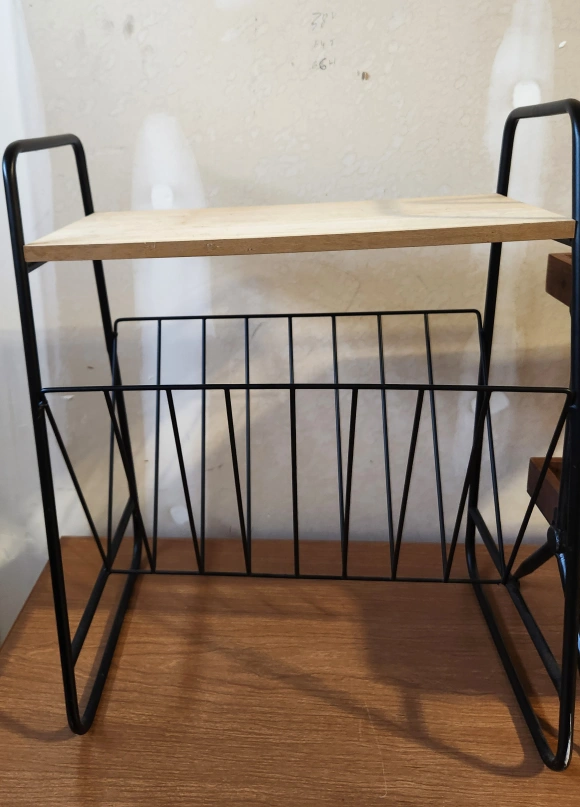 a magazine rack with a shelf on top. It has a black metal frame and a light wood-tone shelf. Perfect for organizing your magazines and adding a touch of style to your living room or office!