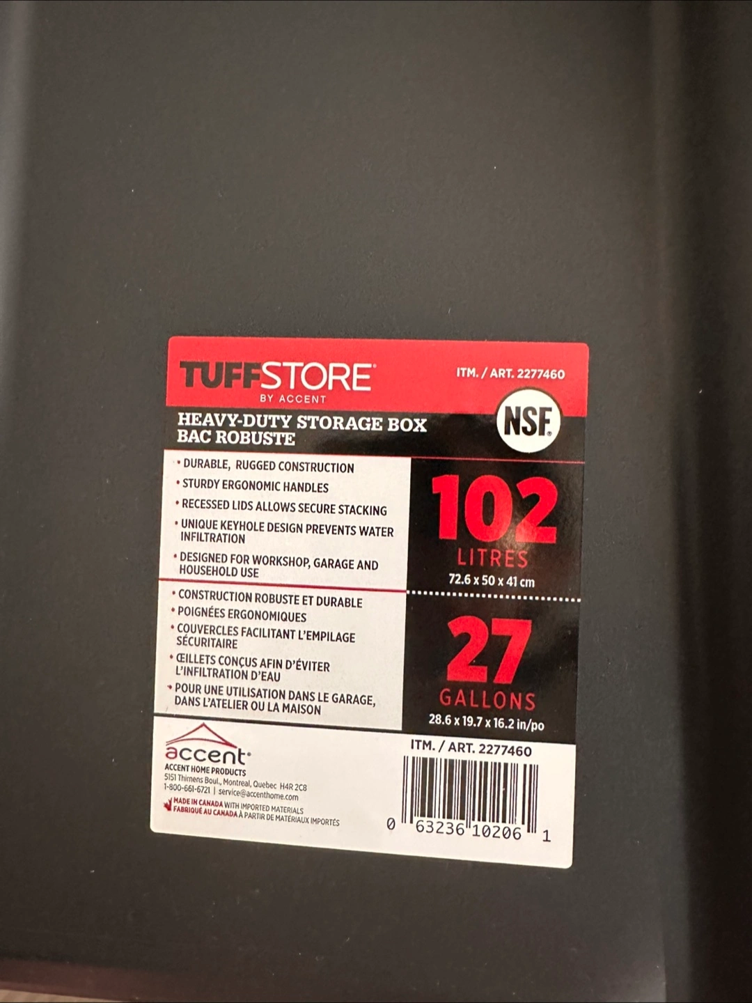 It holds 102 litres (72.6 x 50 x 41 cm) or 27 gallons (28.6 x 19.7 x 16.2 in/po).