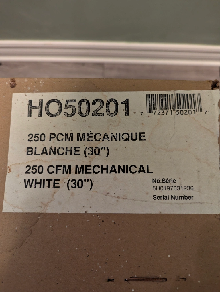 Selling a Venmar range hood, still in its original box! It's 30 inches wide and comes in white. The model number is HO50201. This range hood has a 250 CFM mechanical fan.