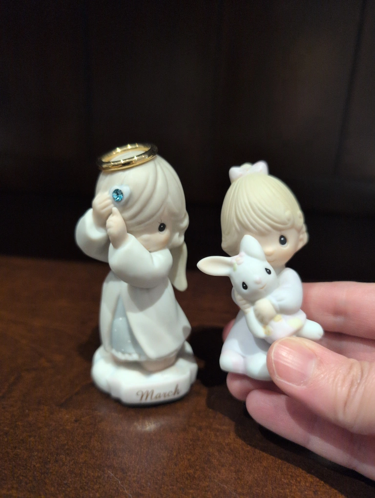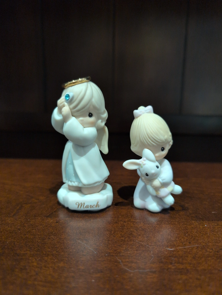 Two adorable Precious Moments angel figurines! One is holding a blue gem to her eye, and the base says "March". The other is holding a bunny rabbit. They're in great shape and ready to find a new home