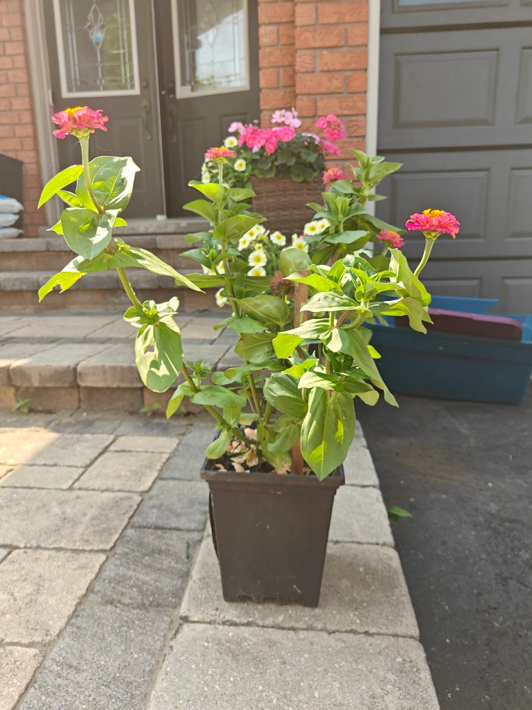 I have a lovely potted Zinnia plant for sale! It's currently in a black plastic pot and features vibrant green leaves and beautiful pink and yellow flowers. Perfect for adding a pop of colour to your garden or patio