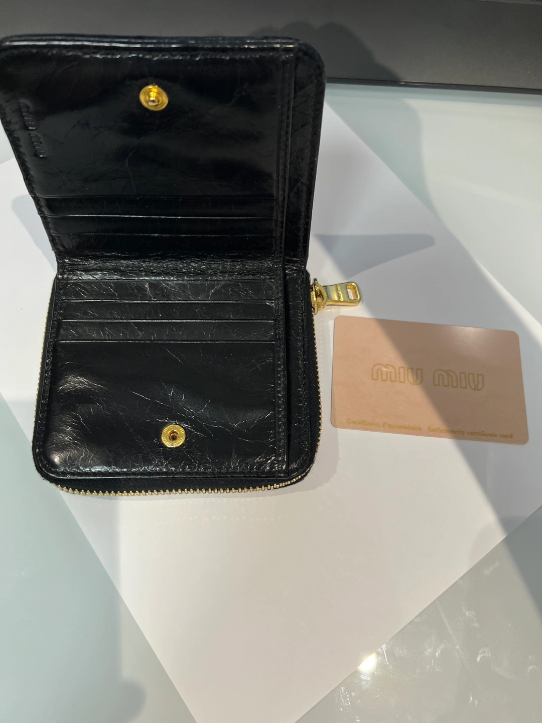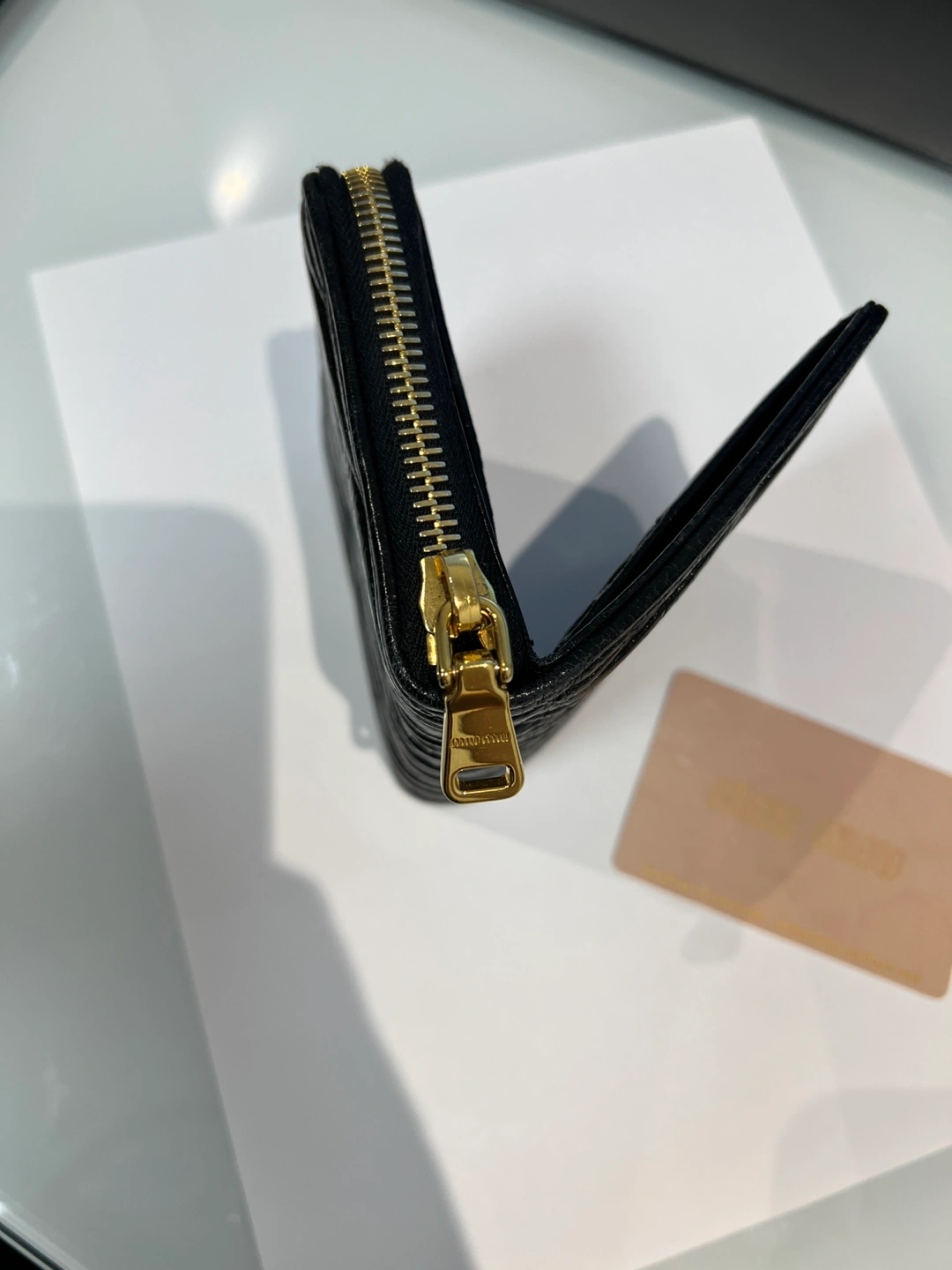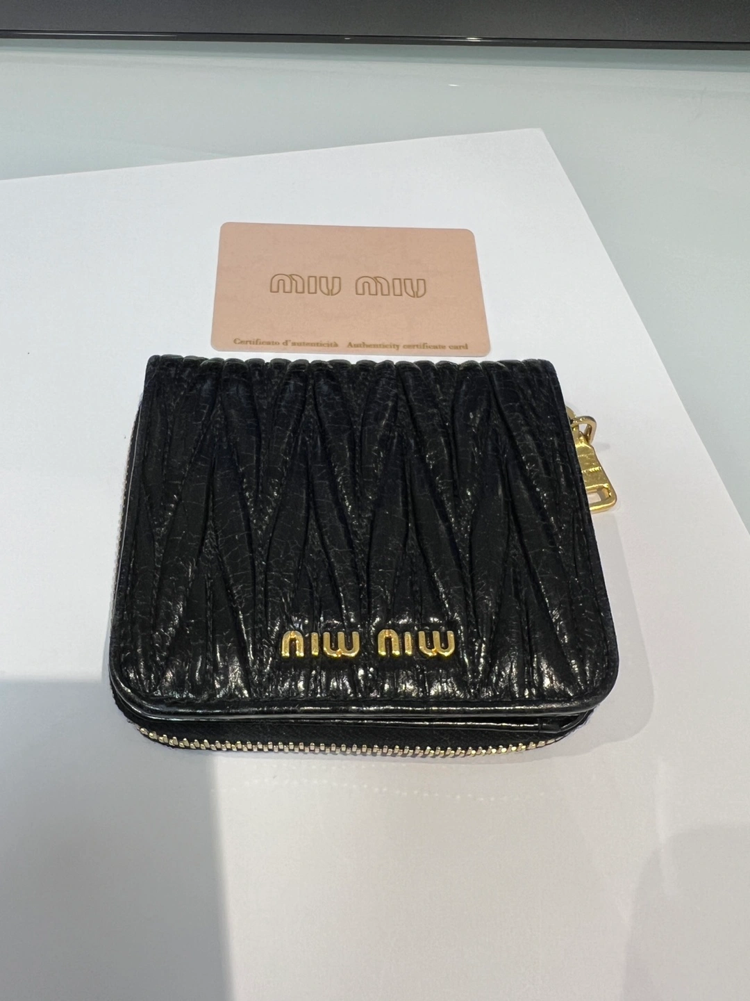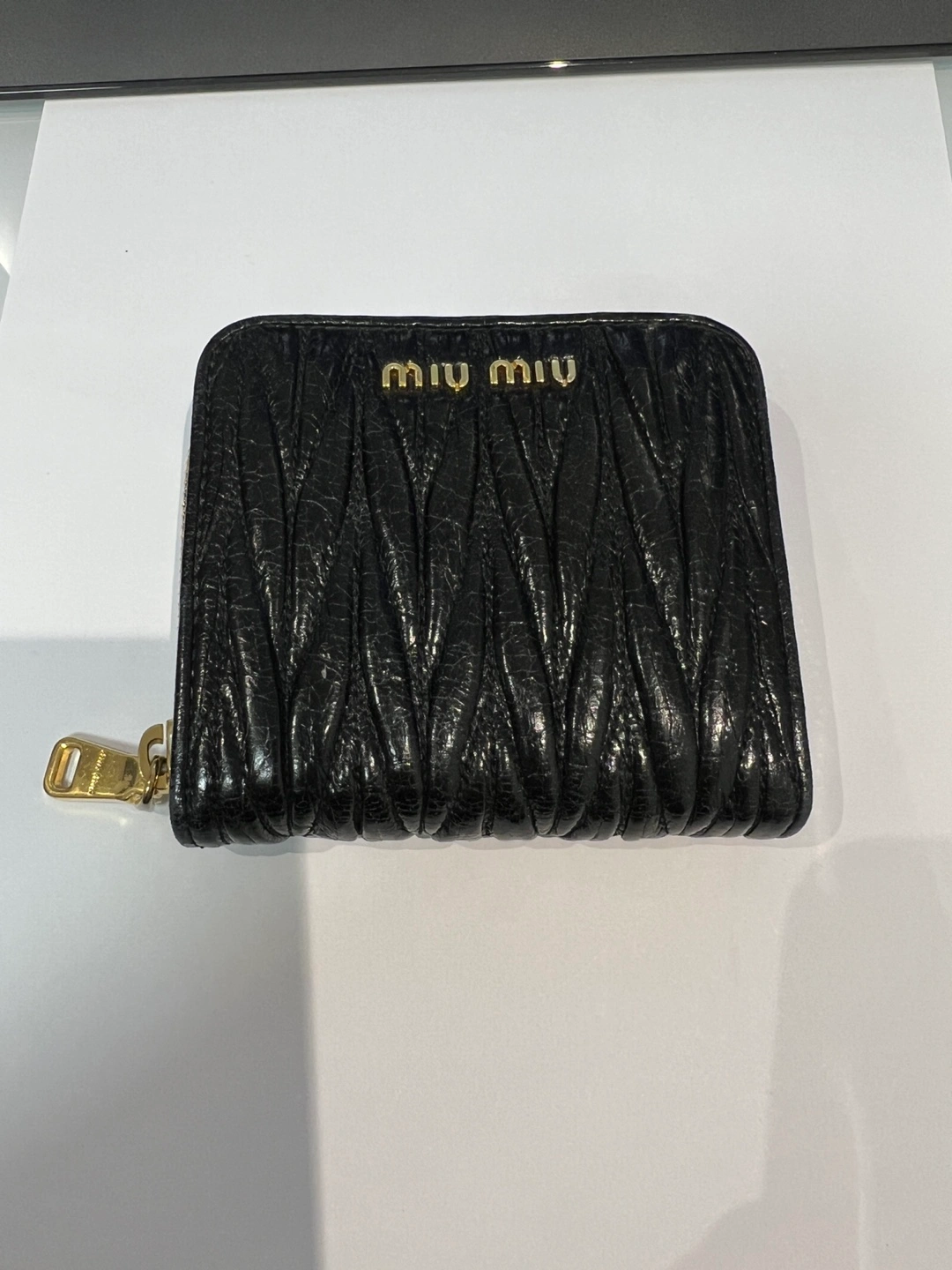 Selling a stylish Miu Miu wallet in black leather. It's in great condition and ready for a new home! Features a unique textured design and the classic Miu Miu logo in gold lettering. Perfect for keeping your essentials organized with a touch of luxury.