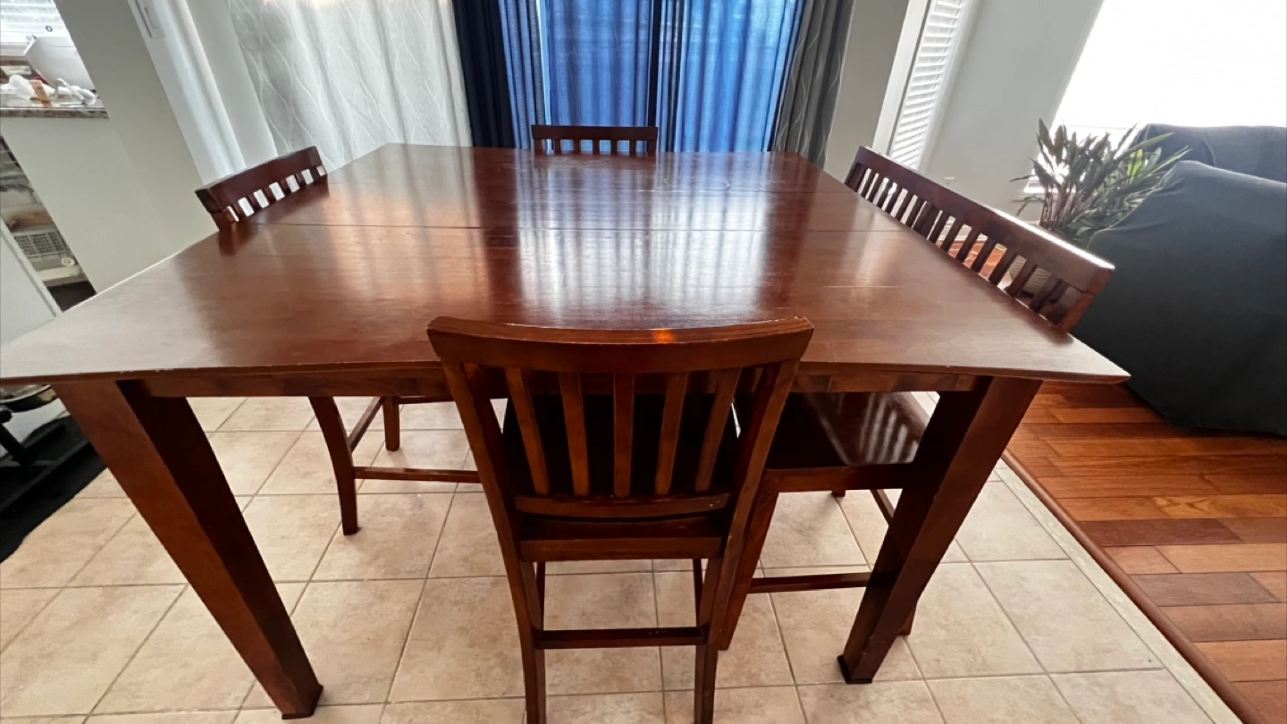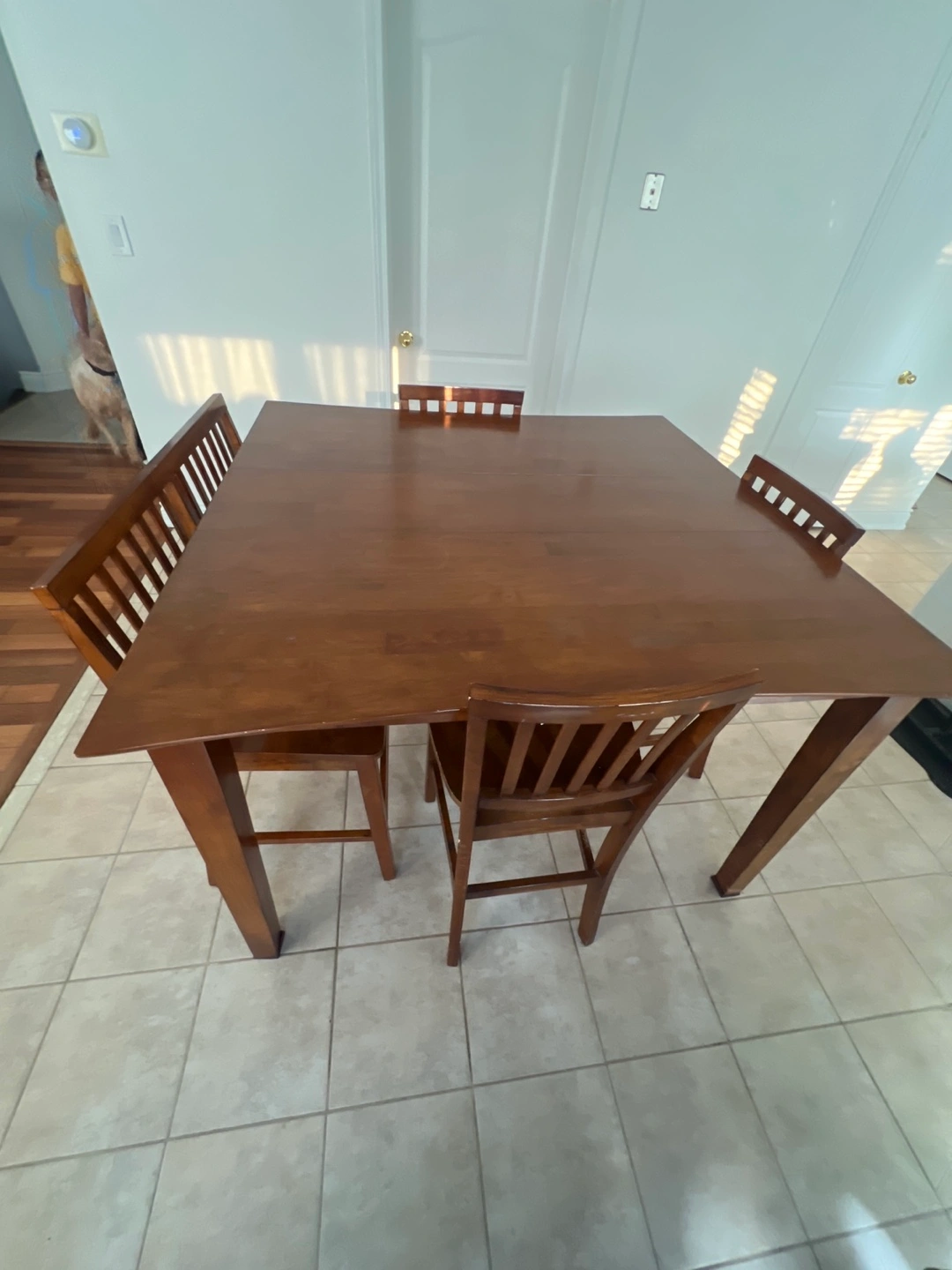 Selling a wood dining table with three matching chairs and a bench. The set is in good condition and perfect for a family dining area or kitchen nook. It's a sturdy and reliable set, ready to be a part of your home!