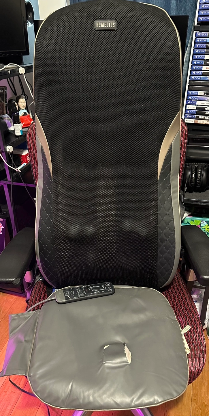This is a Homedics massage cushion with heat. It is in used condition, but still works great! Perfect for relaxing after a long day. Tear due to normal use.
