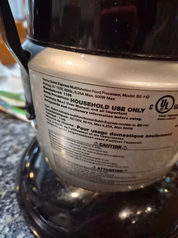 I'm selling a Bullet Express Multifunction Food Processor, model BE-110. It's in great condition and ready to help you with your food prep needs! It's rated for AC120V, 60Hz, 6.25A, and 500W max