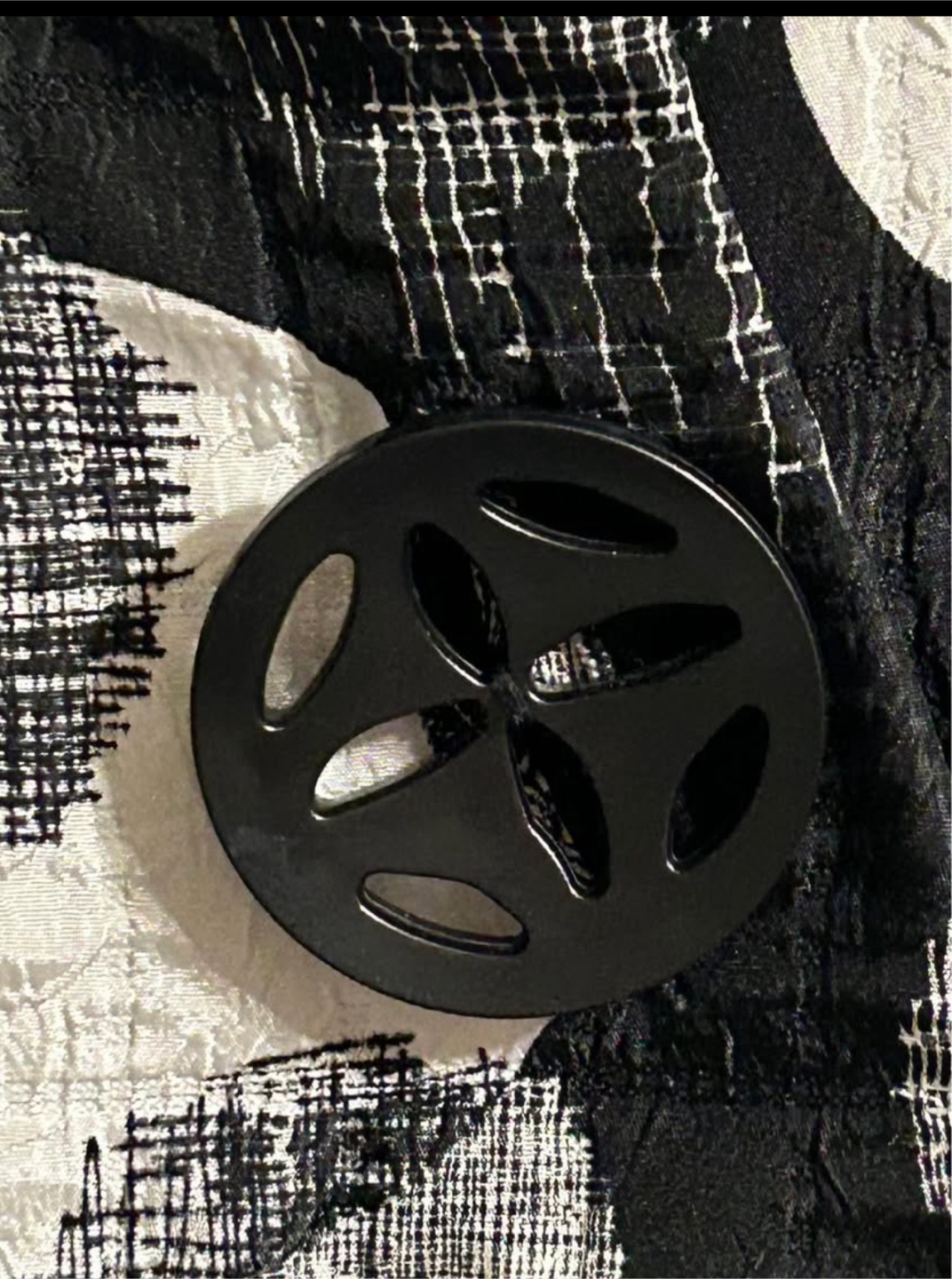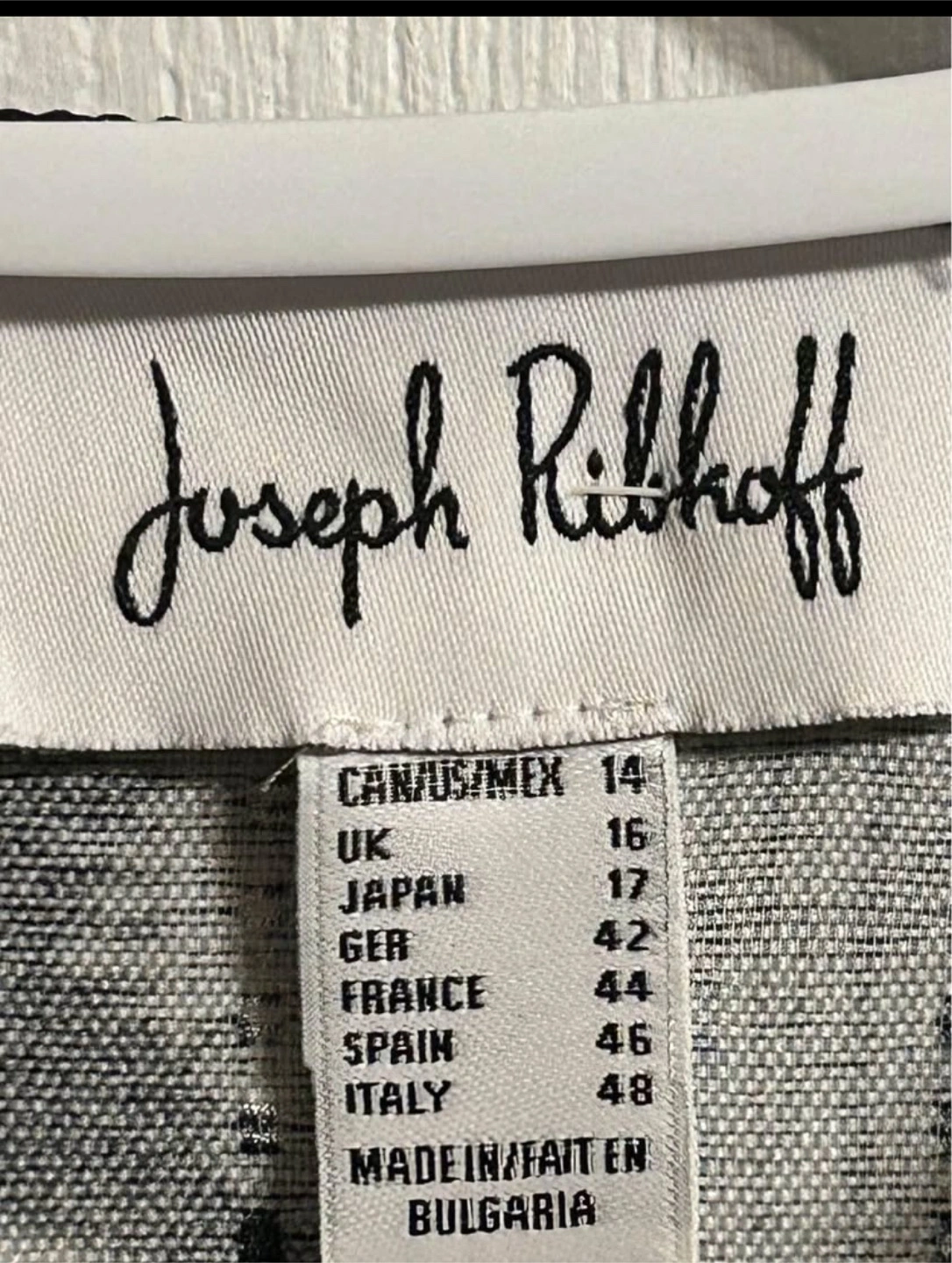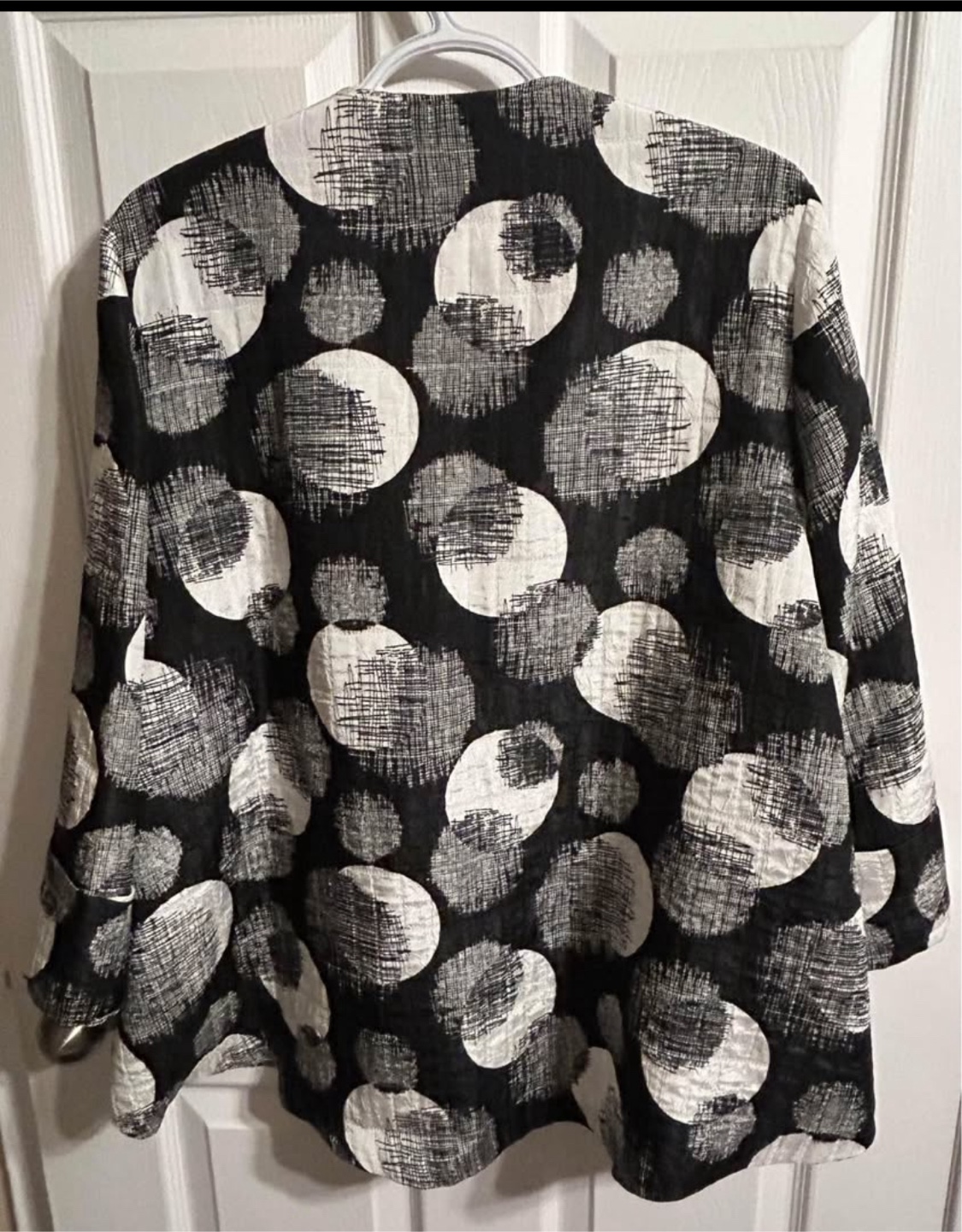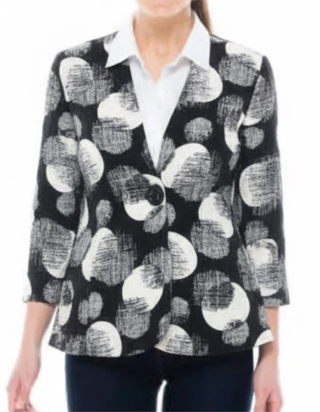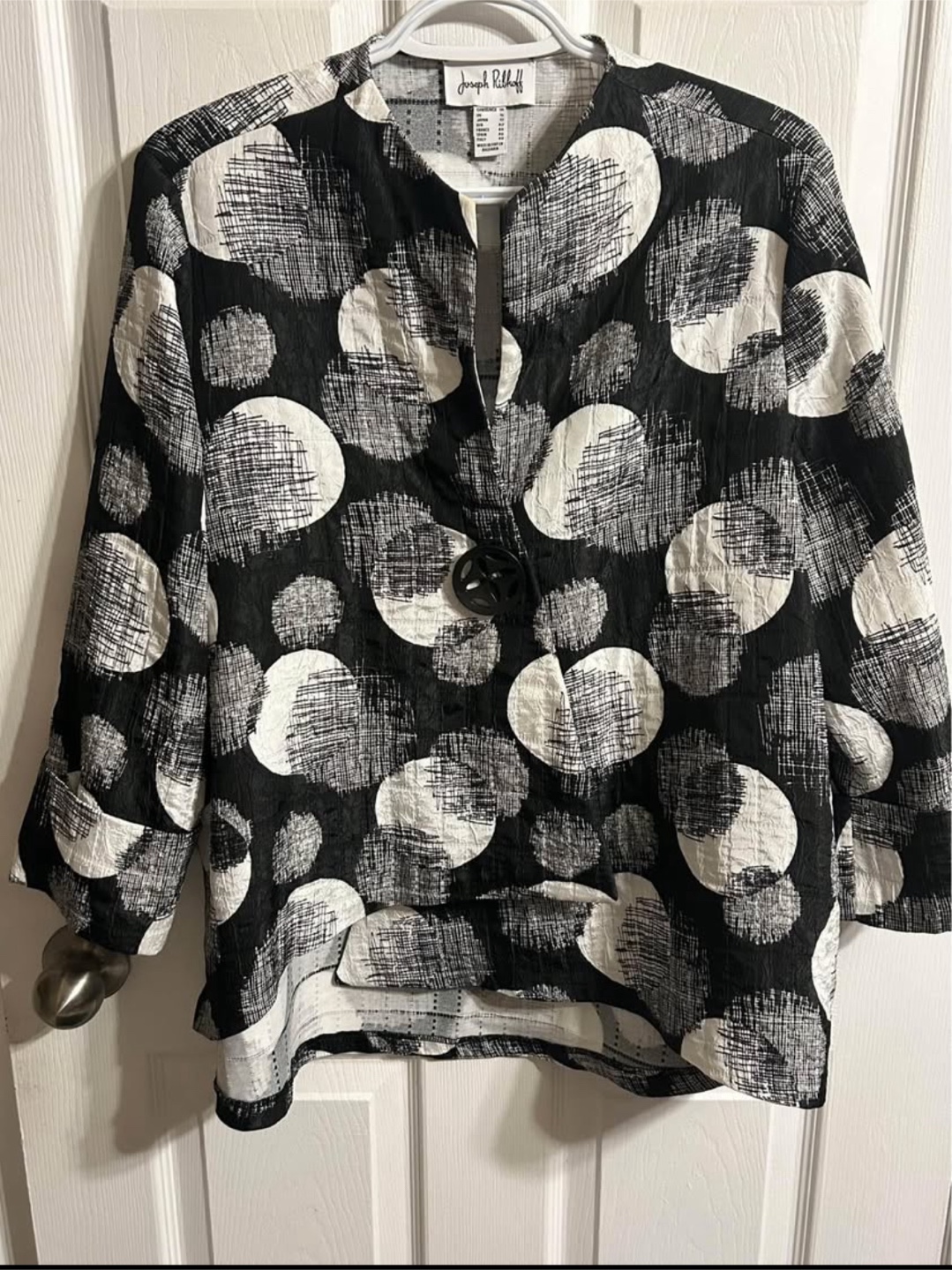 This is a Joseph Ribkoff jacket in a striking black and white pattern. It's a size 14. The jacket has a unique button detail and a stylish design. It's in great condition and ready for a new home!