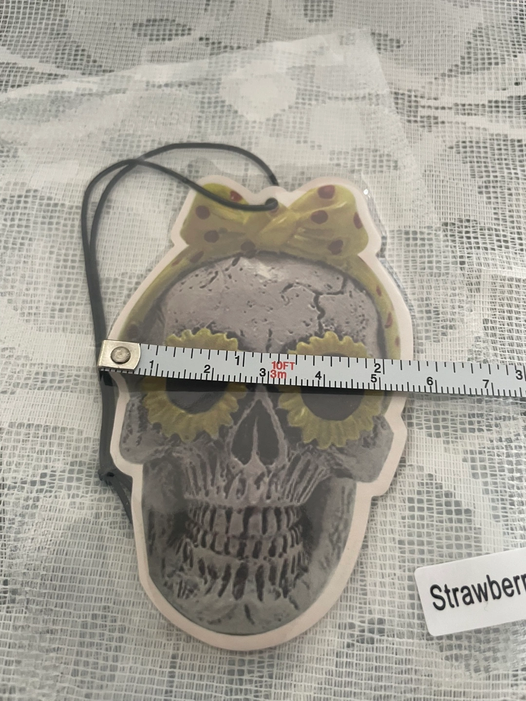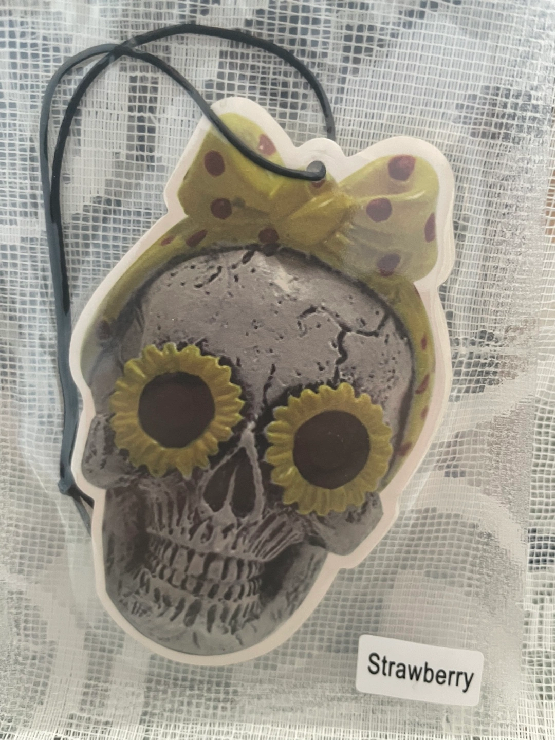 Cute strawberry scented skull air freshener! The skull has sunflower eyes and a polka dot bow. It's about 4 inches tall and 3 inches wide. Perfect for adding a bit of spooky fun to your car or room