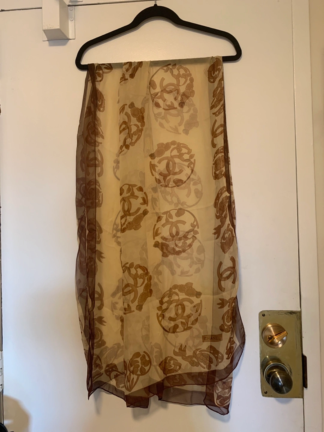 Selling a lovely like Chanel silk scarf. It features a beautiful pattern with the iconic Chanel logo and floral designs in shades of brown and beige. It's in great condition and would add a touch of elegance to any outfit!