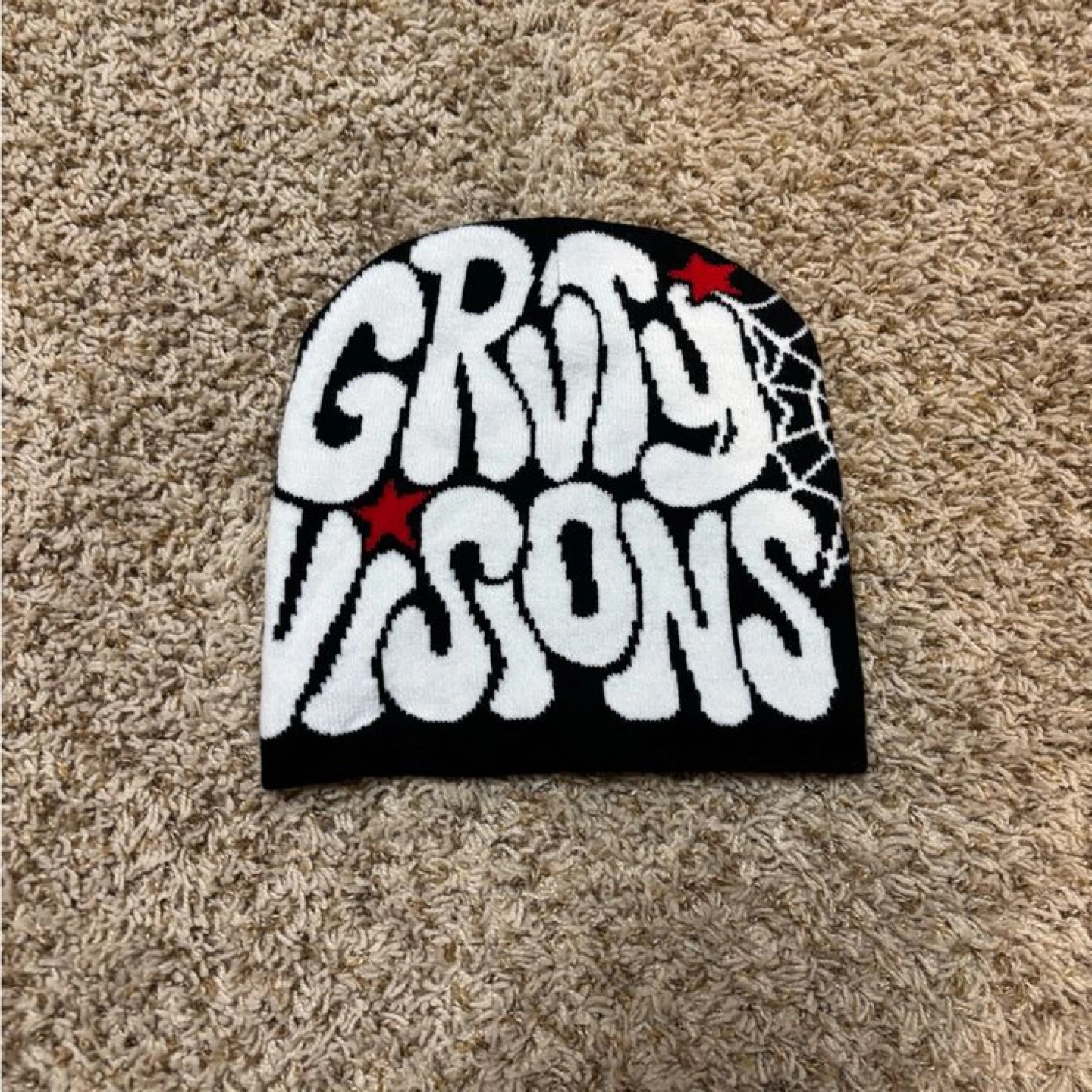 Selling a GRTY VISONS beanie. It's black with white lettering and a red star detail. Perfect for Fashion.