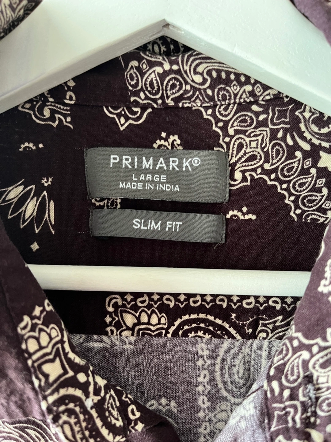 Here's a stylish Primark shirt in size large (slim fit). It features a unique purple and off-white paisley pattern. Perfect for adding a bit of flair to your wardrobe.