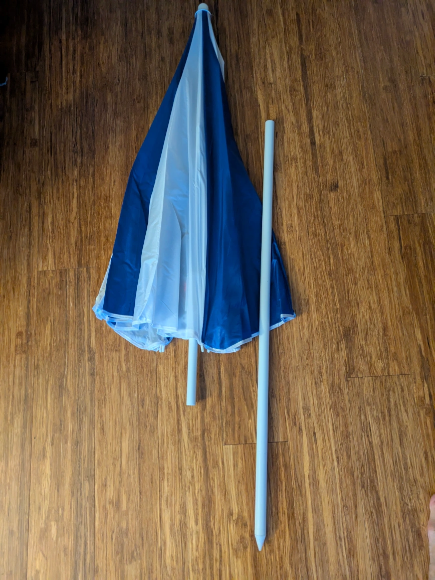 Selling a blue and white beach umbrella! It's in great shape and ready for some sunny days at the beach or park. Lightweight and portable, it comes with a plastic bag, it's easy to carry and set up