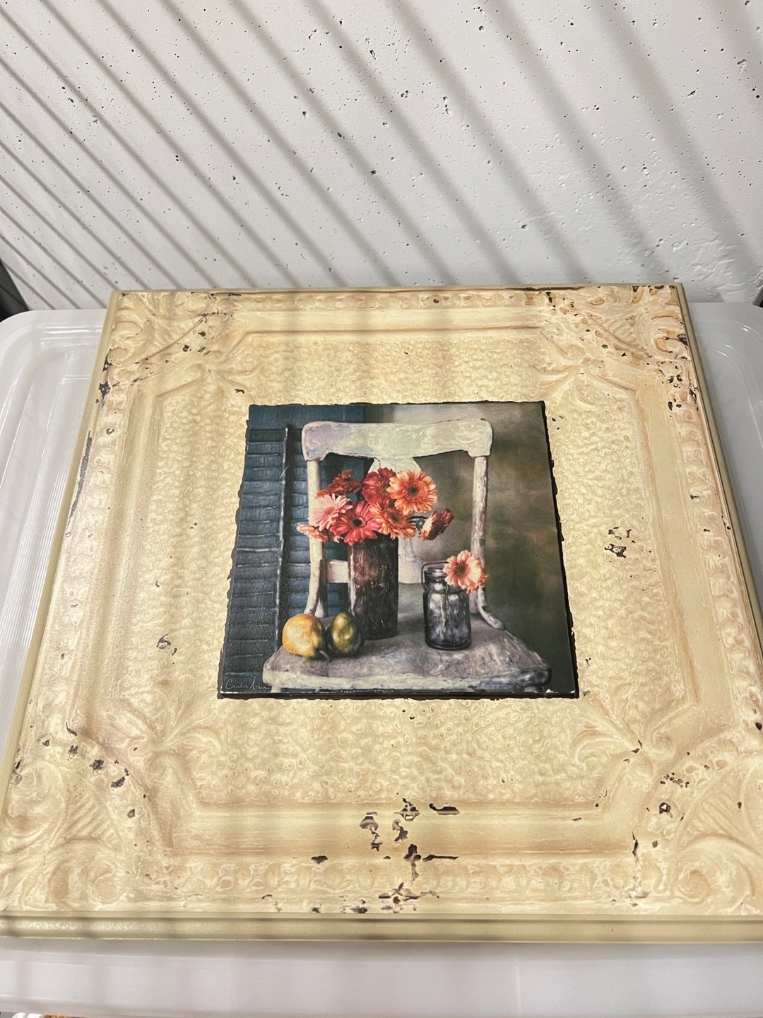 Selling a wooden art print featuring a floral arrangement. The print is in good condition and ready to hang. Would look great in any room!