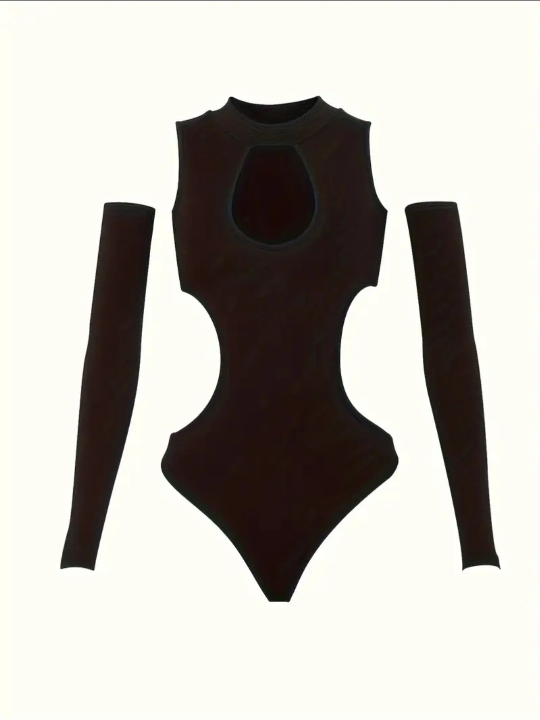 Selling a black cutout bodysuit that comes with matching sleeves. Great for a night out or a rave. The material is comfortable and stretchy